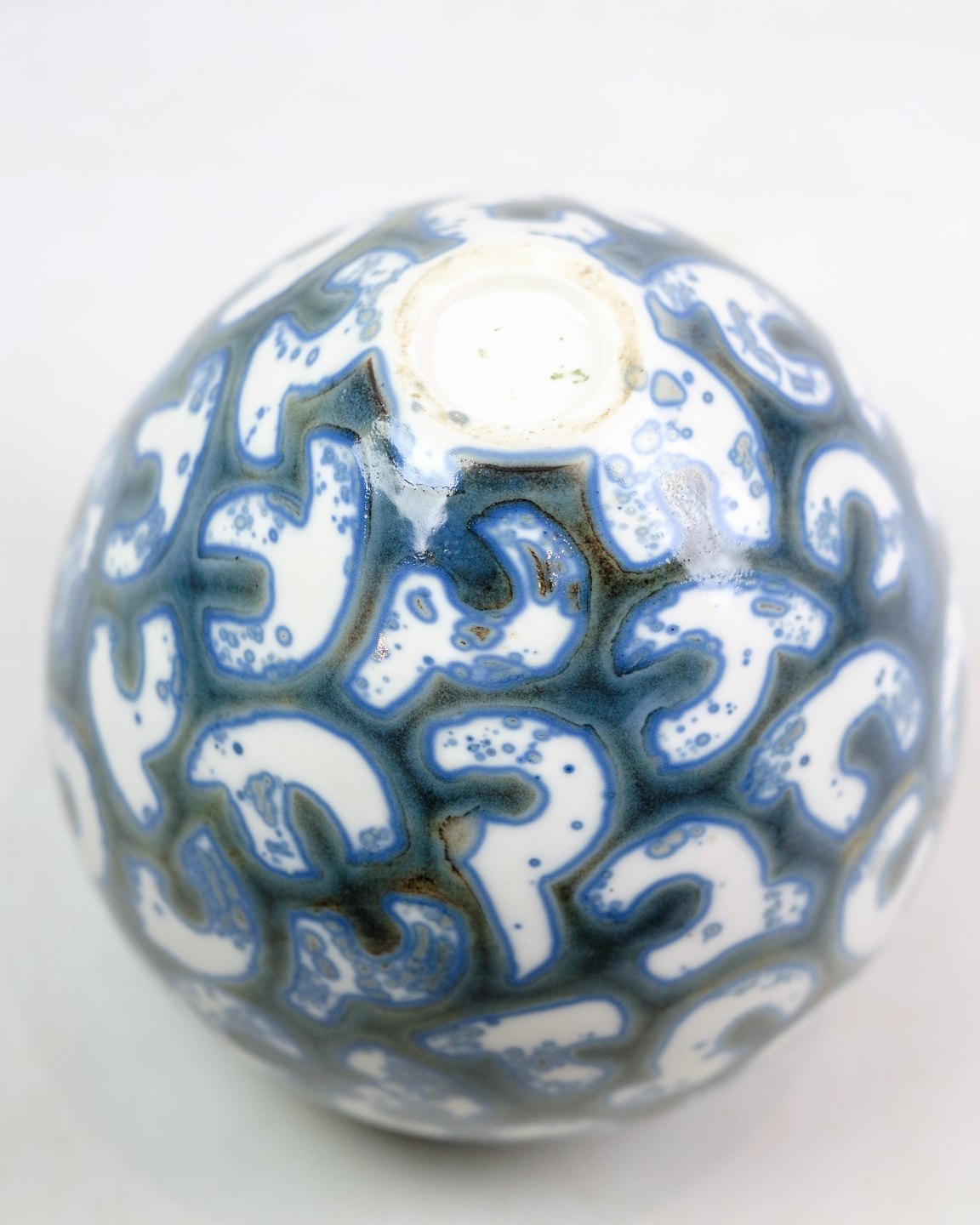 Ceramic vase by Per Weiss, a renowned Danish ceramist, known for his talent and contribution to handicrafts. The vase is patterned with blue and white colors and dates from around the 1990s. Per Weiss lived in Gammel Lejre, where he carried out his craft and had his shop. This ceramic vase represents his artistic style and expertise in the field of ceramics. The unique color pattern and the temporal context make the vase an interesting collector's item for those who value Danish craftsmanship.