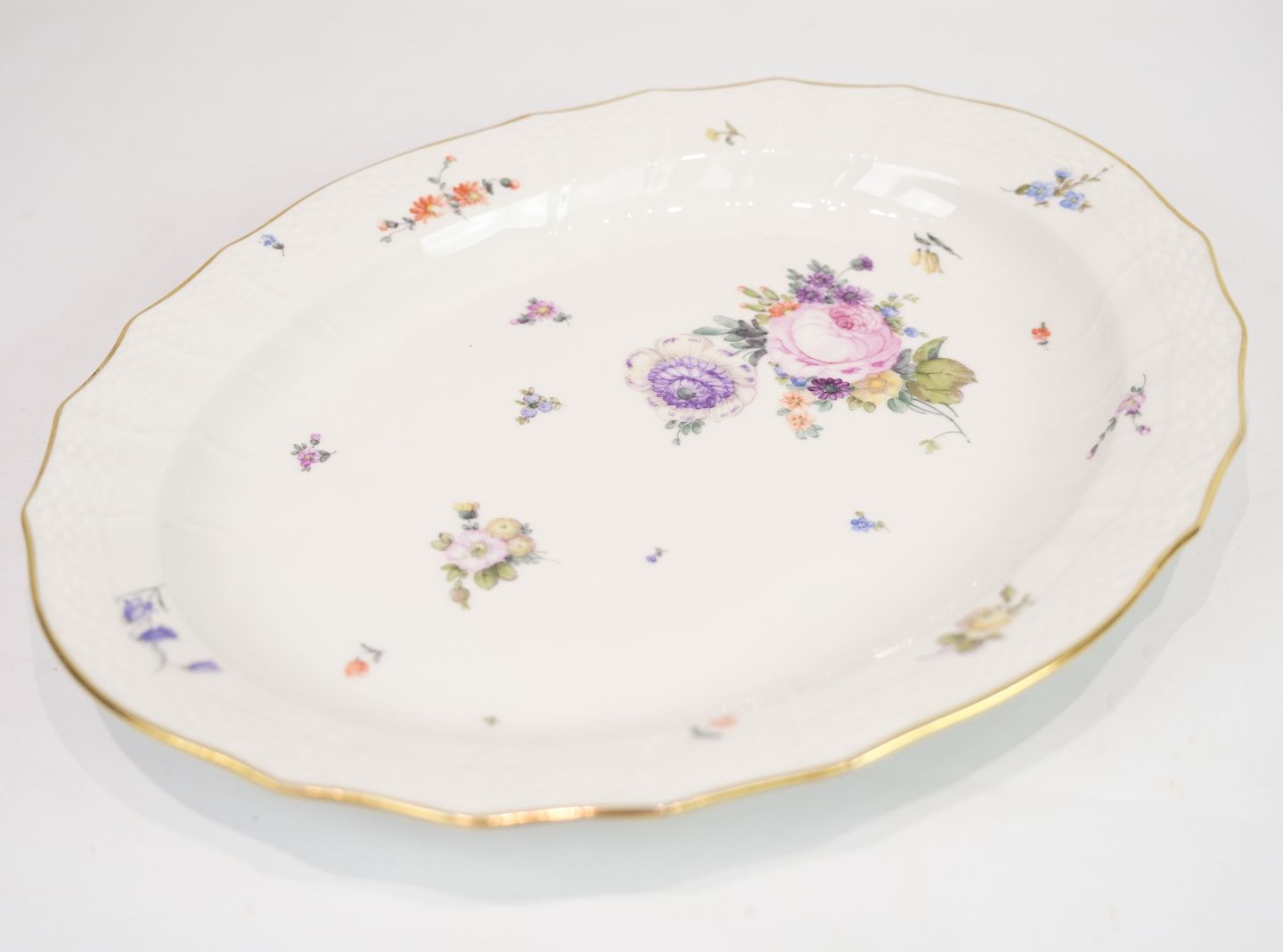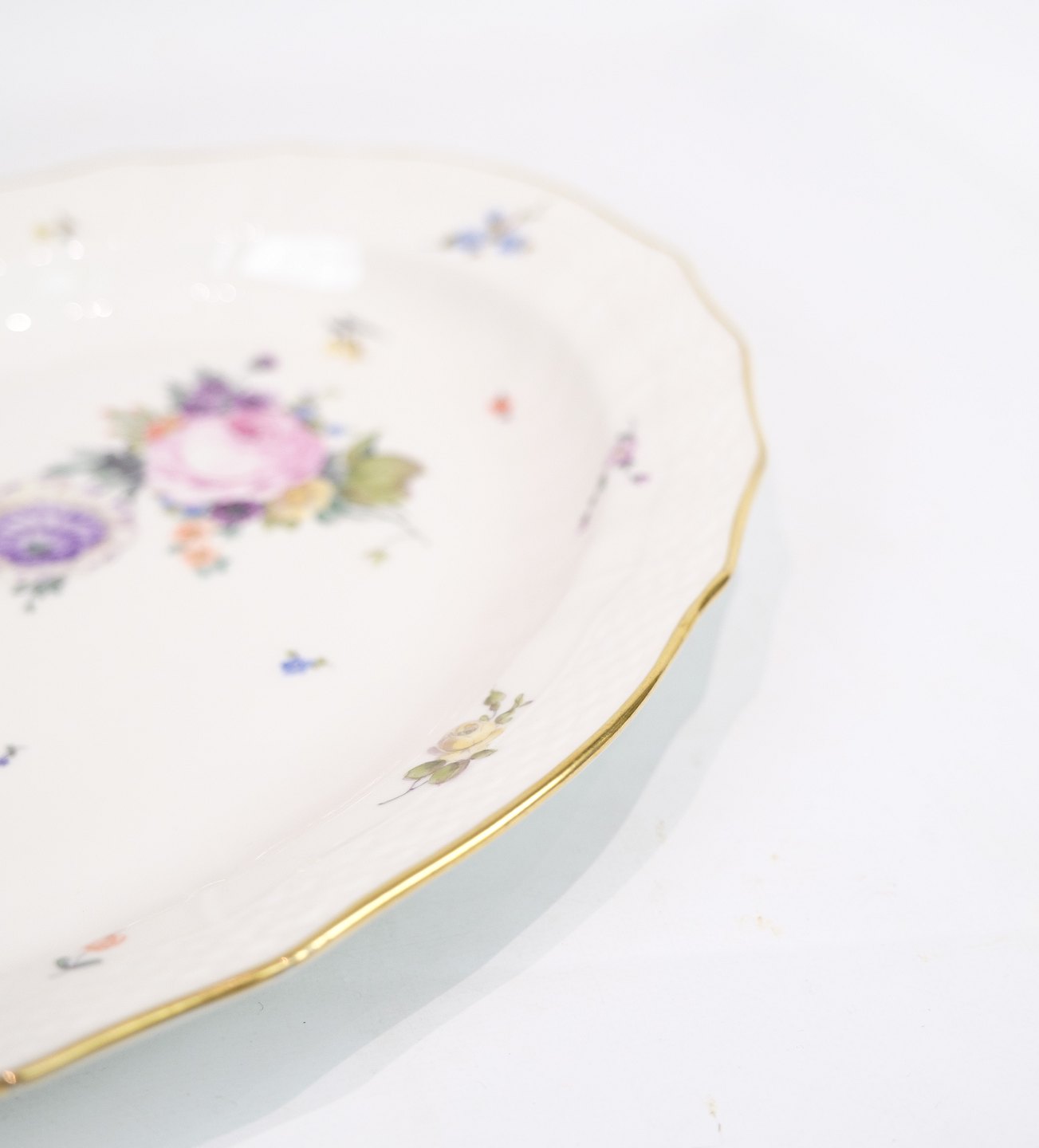 Fad af Kongelig porcelæn med mønstret Saksisk blomst dekoreret i kanten med guld. Fremstillet af Royal Copenhagen i ca. 1923, hvor alle deres varer er blevet håndmalet og efterfølgende blevet meget sjældne. Fadet står uden mangler eller defekter.