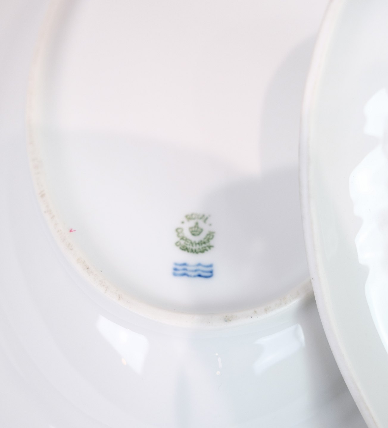 Stort Låg Fad dekoreret med en "Putti" siddende på låget lavet af Kongelig porcelæn med mønstret Saksisk blomst dekoreret i kanterne med guld. Fremstillet af Royal Copenhagen i ca. 1923, hvor alle deres varer er blevet håndmalet og efterfølgende blevet meget sjældne. Fadet står uden mangler eller defekter.