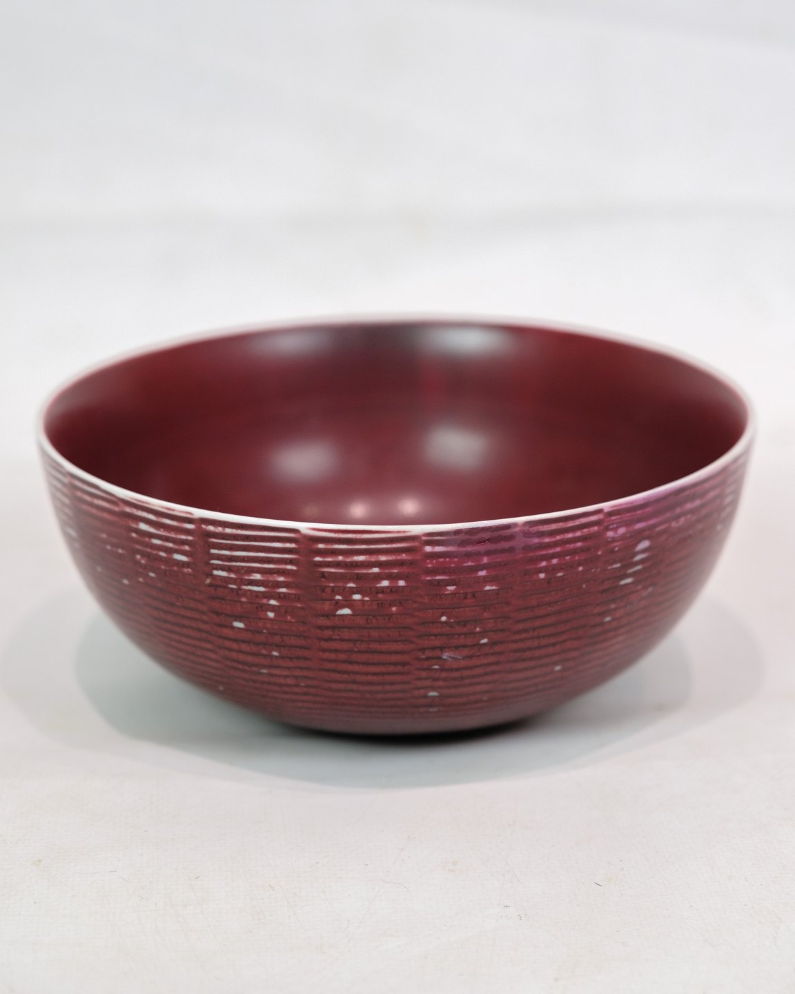 Keramikskål, model 20.717, med okseblodsfarvet glasur, designet af Axel Salto for Royal Copenhagen. Skålen er et klassisk eksempel på Salto's eksperimenterende tilgang til keramik, hvor han brugte mange forskellige glasurer for at skabe dybe og rige farvetoner.