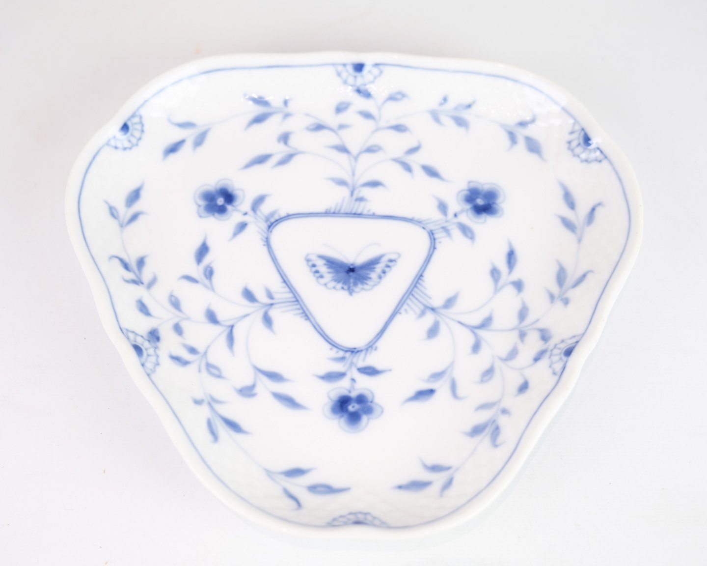 Trekantet fad nr. 4 fra Bing & Grøndahl. Udført i porcelæn med håndmalet sommerfuglmotiv. Unik form, velegnet til servering eller som dekorativt element. Stemplet under bunden.