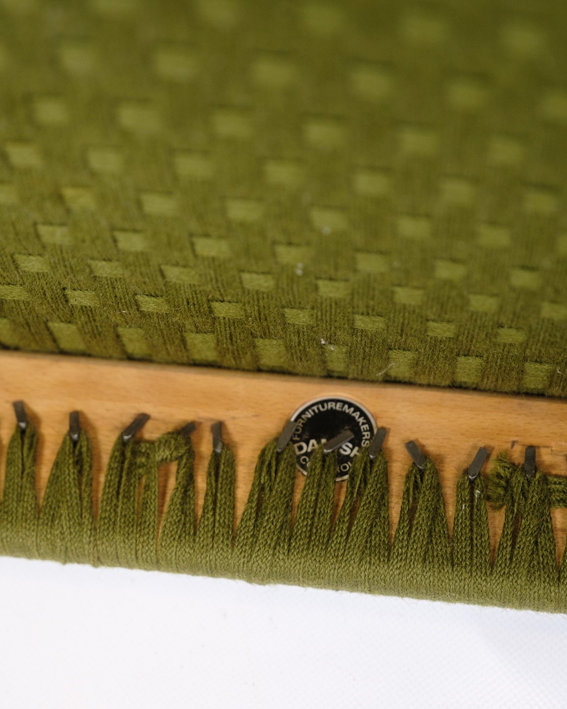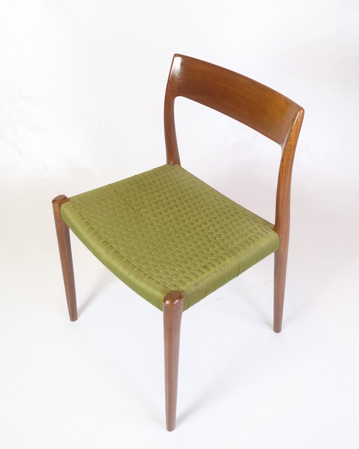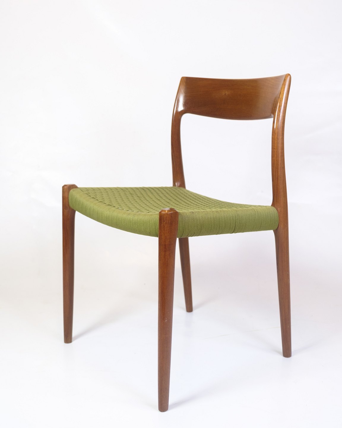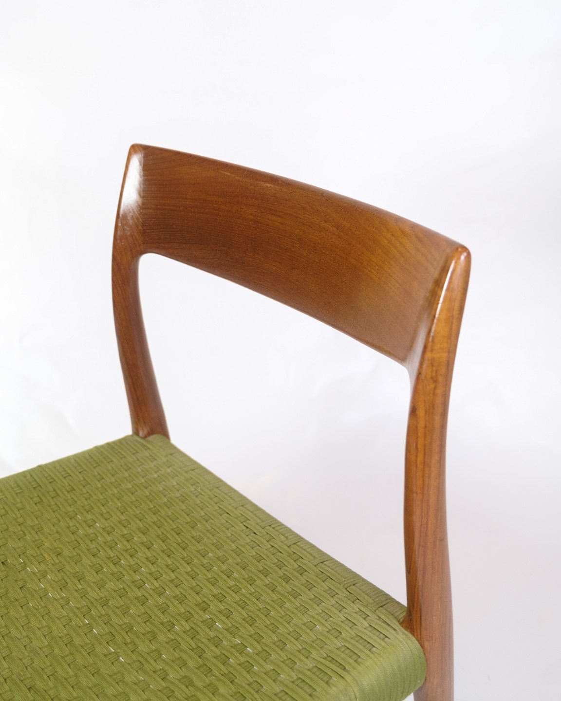 SoldSix dining chairs designed by Niels O. Møller in the 1960s. Model 77 is made of teak with seats in green paper wicker. The chair's simple lines and curved backrest provide good seating comfort and a clear design language that has made Møller's design a permanent part of Danish furniture history. A solid choice for both classic and modern interiors.
