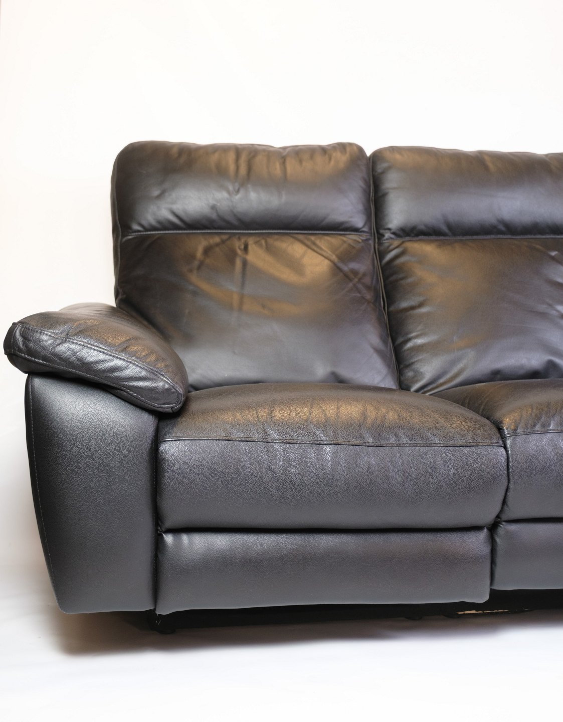 3-seater sofa made of black leather. The sofa is equipped with an adjustable backrest and legrest, which are operated electronically. It appears to be in good condition, and all electronics have been tested and are working correctly.