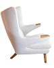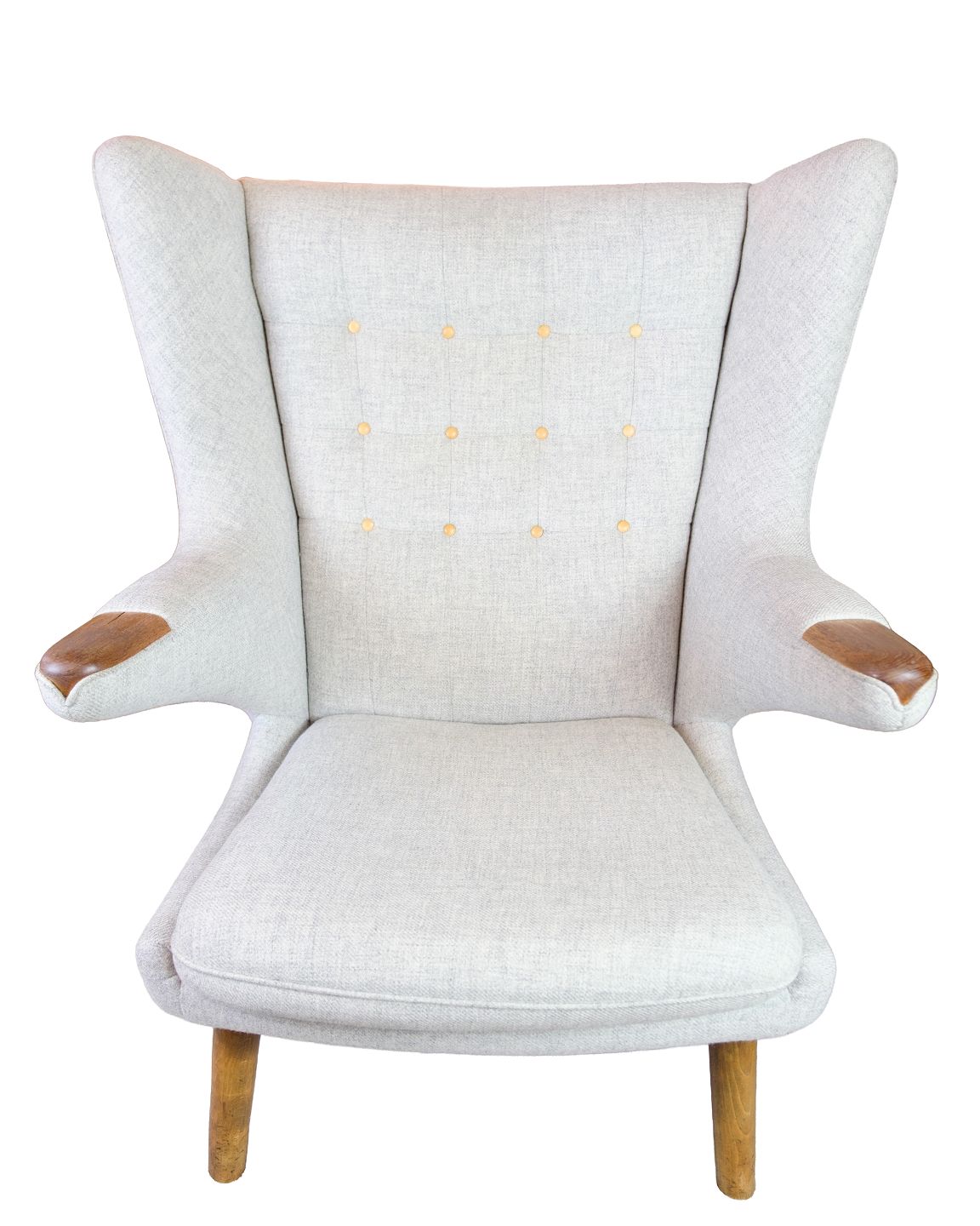 Bamsestolen model AP19, designet af Hans J. Wegner i 1951. Stolen er betrukket med lysegråt Hallingdal-stof og udført med armlæn i massiv teak. Et møbel, der kombinerer skulpturel form med enestående siddekomfort.