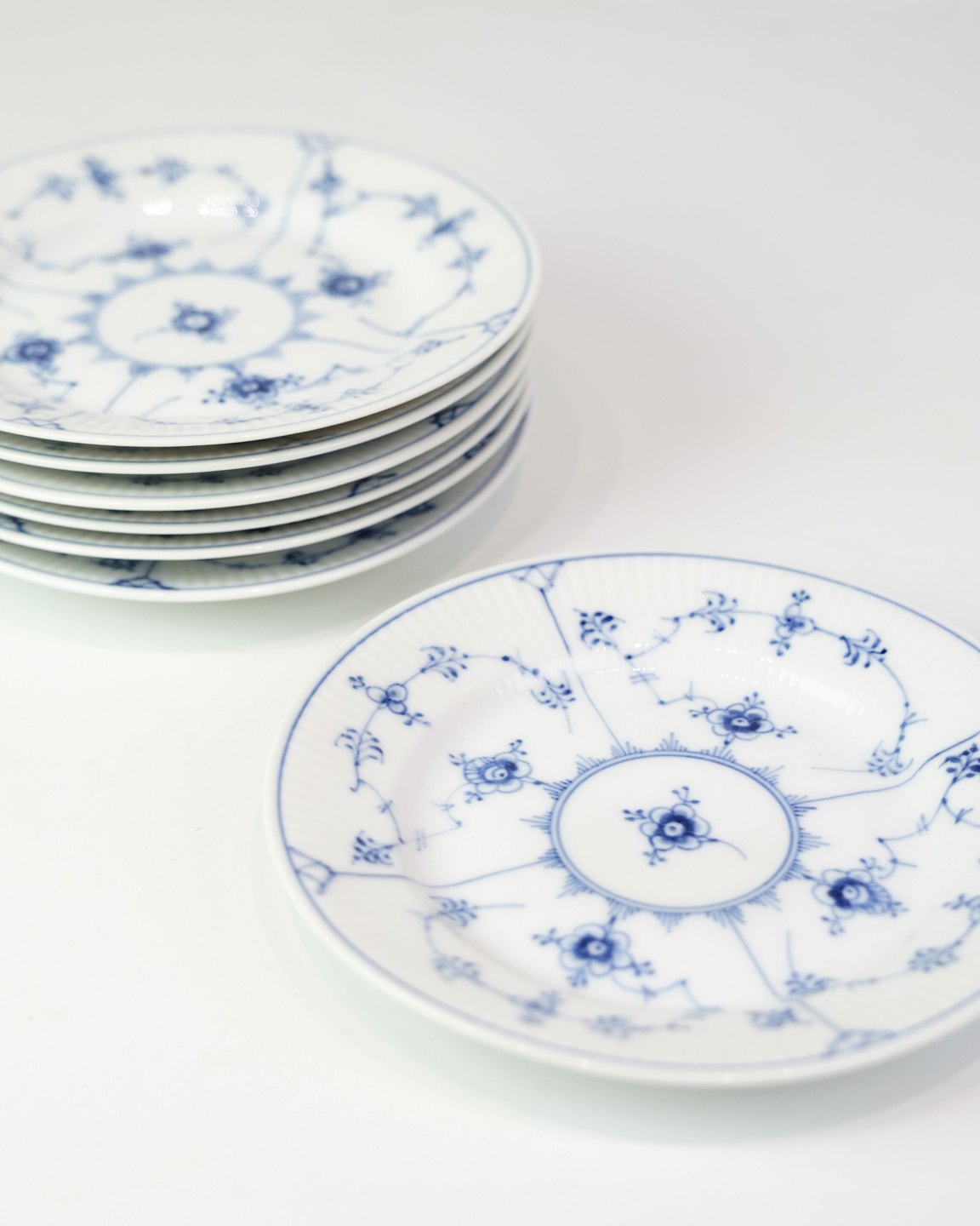 Kagetallerken fra Royal Copenhagen i musselmalede riflet mønster. Model No. 1/181 og er håndmalet i koboltblå på hvidt porcelæn med de berømte riflede detaljer. En fin størrelse til servering af kage, dessert eller småretter