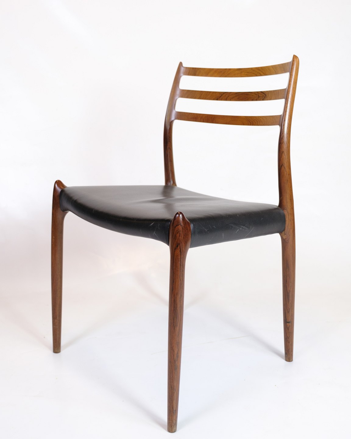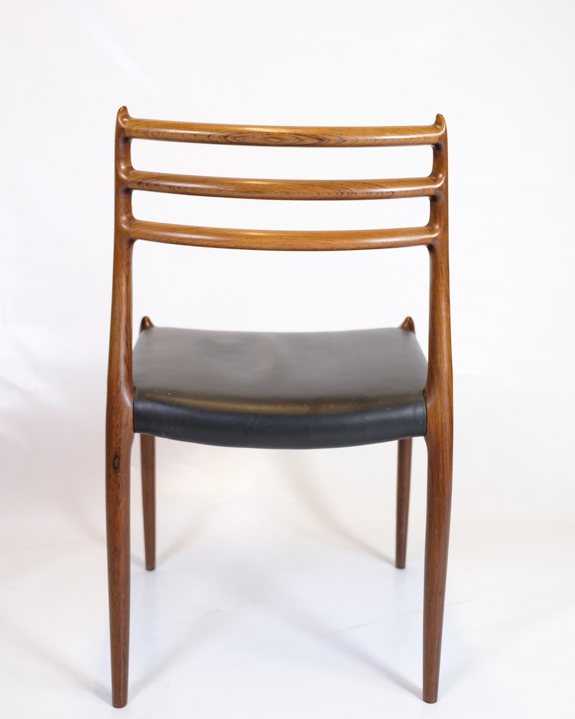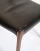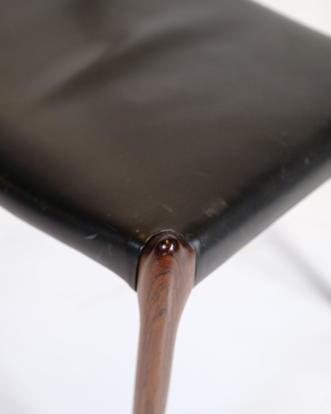 Sæt på fire spisebordsstole i massiv palisander, designet af Niels O. Møller og fremstillet af J.L. Møllers Møbelfabrik i 1950’erne. Stolene har sort læderpolstring og det karakteristiske ryglæn med tre vandrette stave, som er et gennemgående træk i Møllers formsprog.