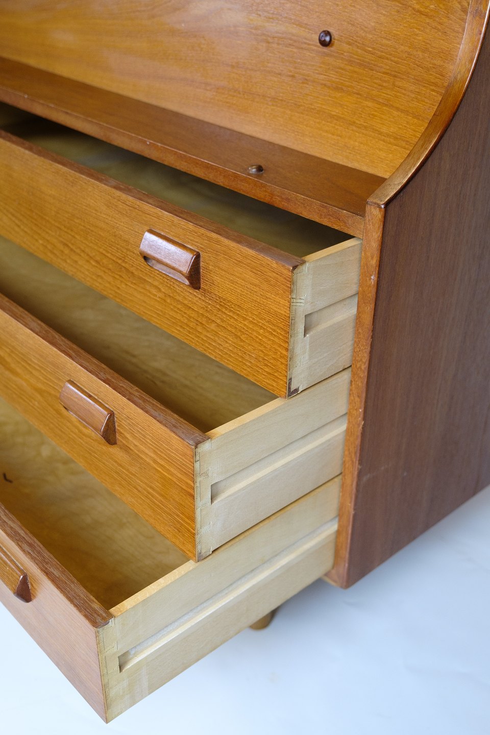 Chatol tegnet af Børge Mogensen (1914–1972) for Søborg Møbelfabrik. Udført i teaktræ med massive ben af eg. Øverste sektion skjules bag en klaplåge og rummer to små skuffer, åbne rum og fire brevbakker. Nederst tre rummelige skuffer med karakteristiske integrerede greb.