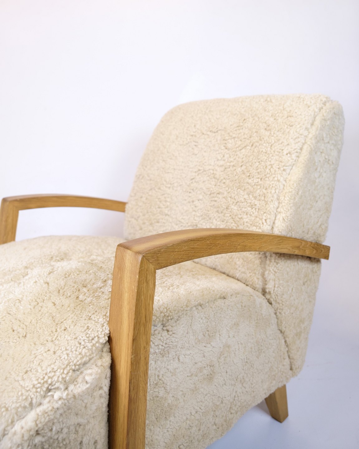 Lænestol i fåruld og egetræ. Komfortabel og dekorativ stol med tidløst design og varme materialer.