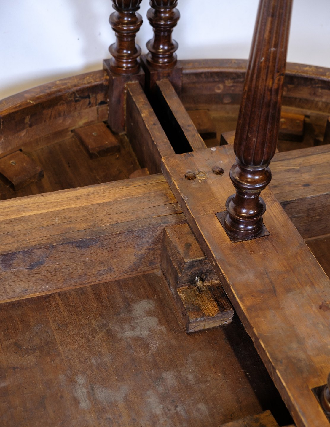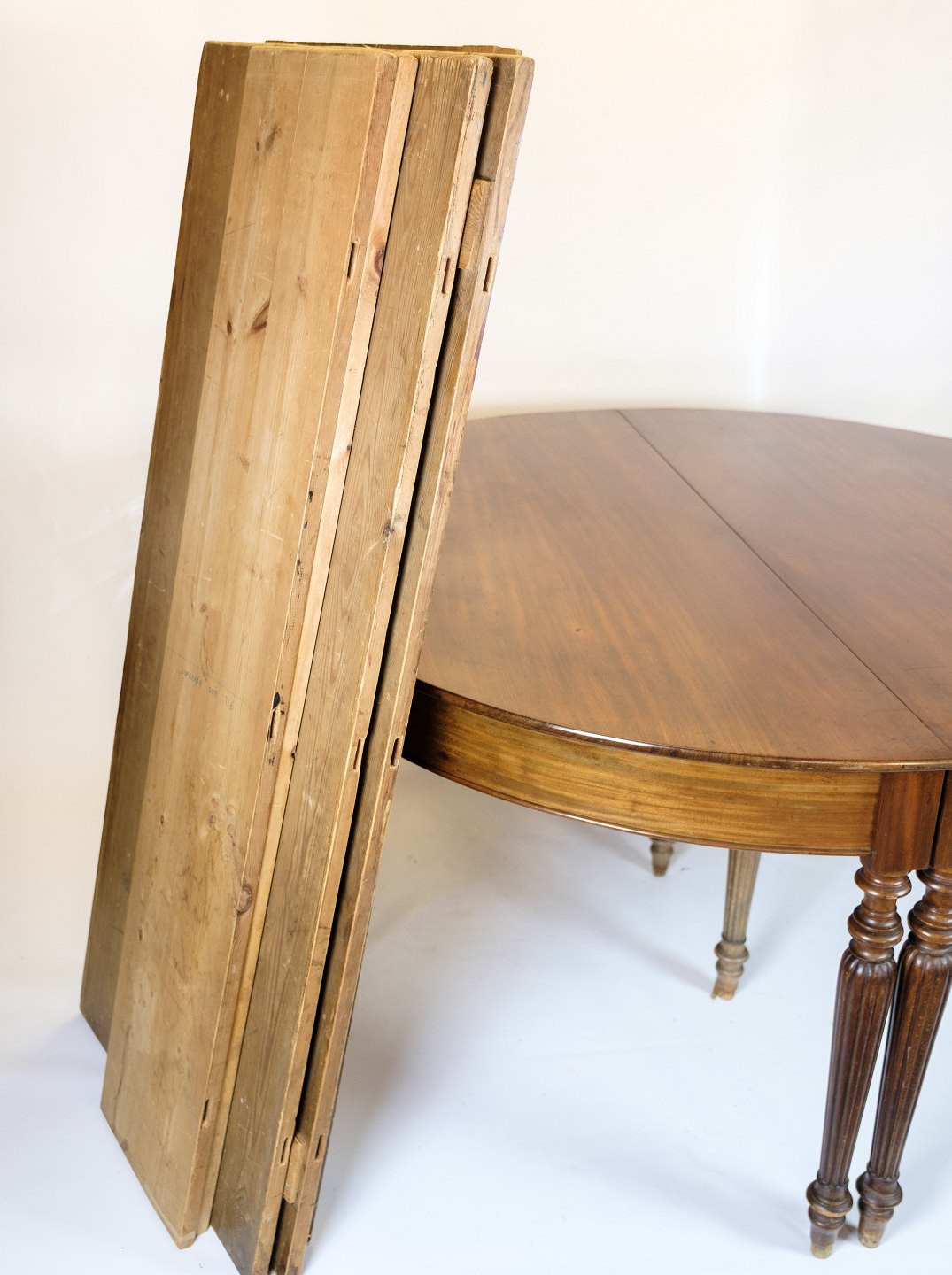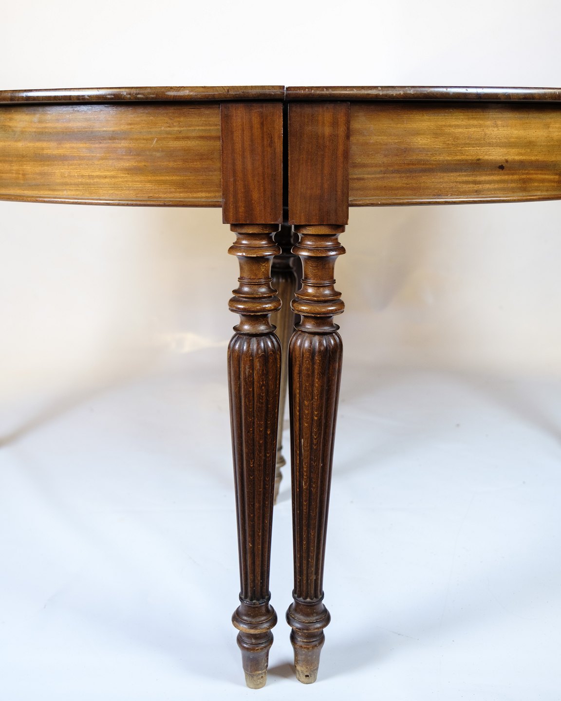 Antikt rundt spisebord i mahogni fra ca. 1840’erne med rillede ben og fem originale tillægsplader. Elegant klassisk møbel med historisk charme.