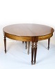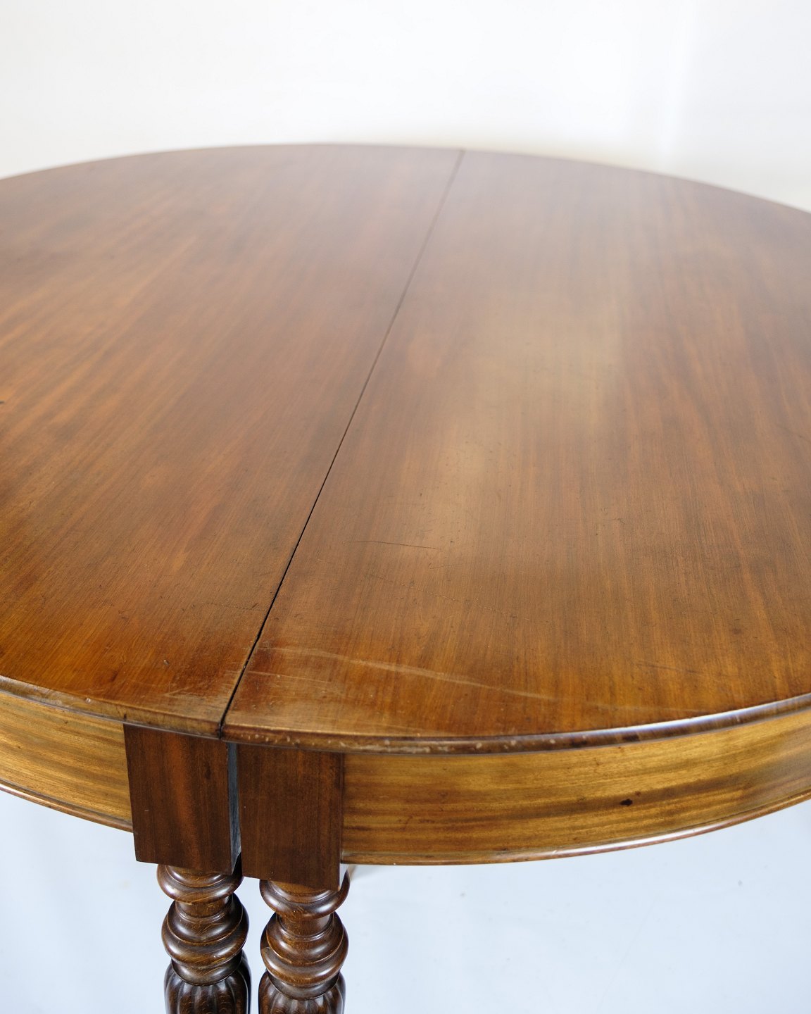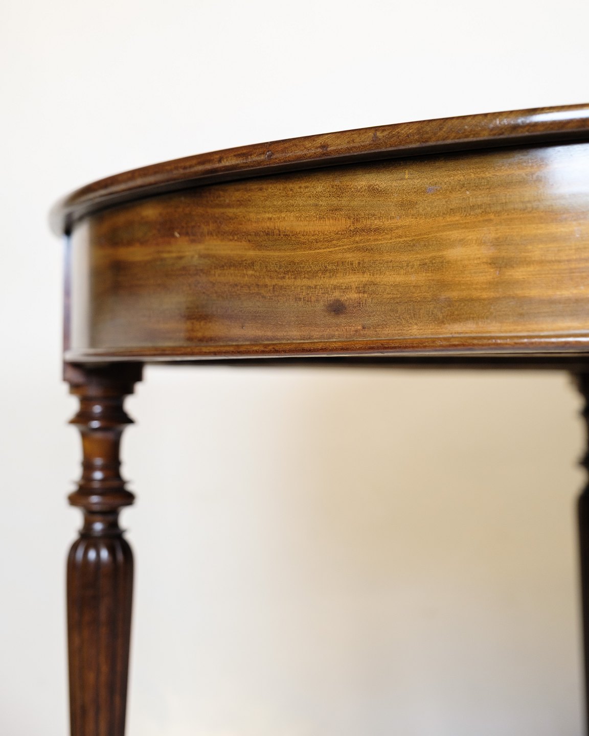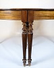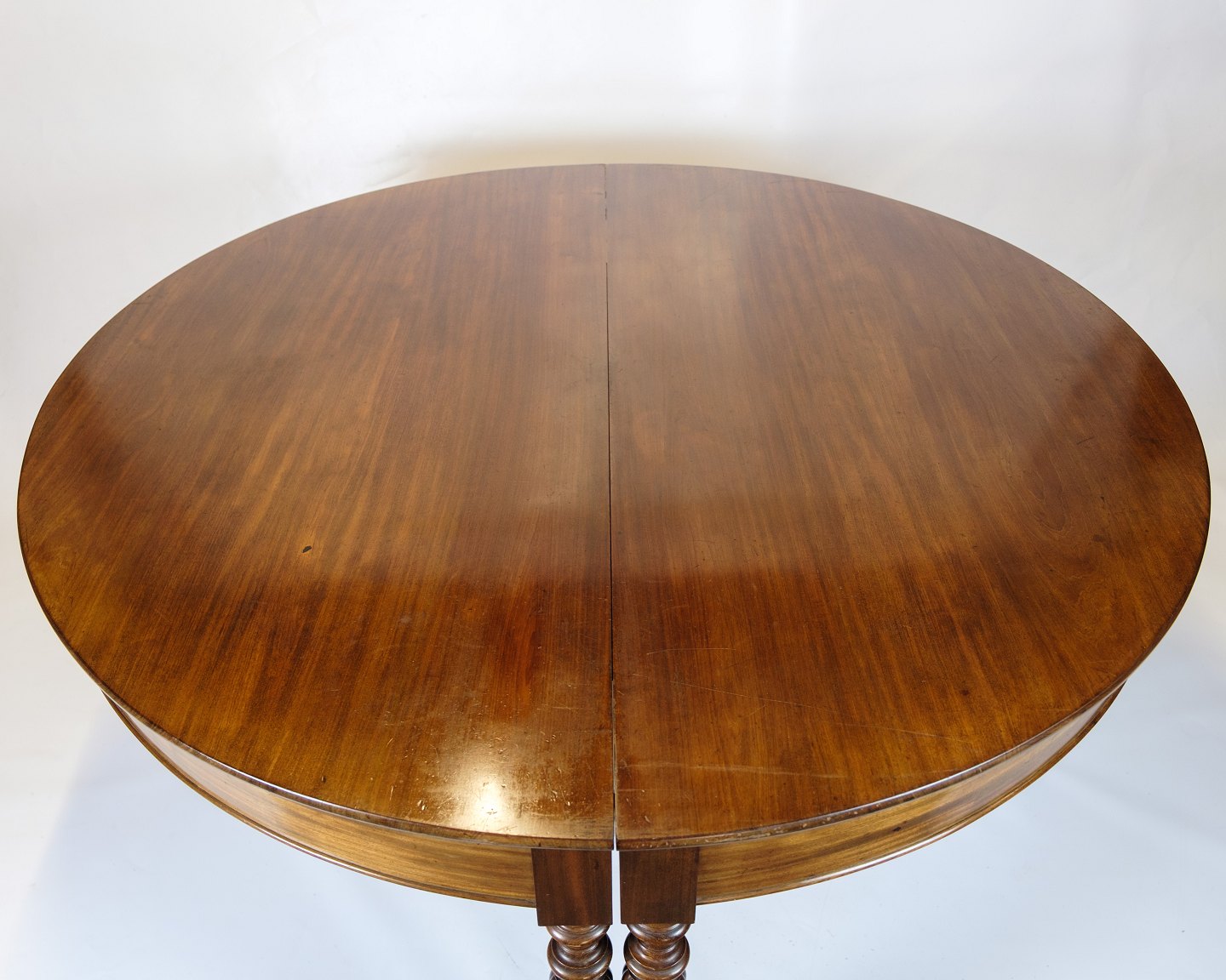Antikt rundt spisebord i mahogni fra ca. 1840’erne med rillede ben og fem originale tillægsplader. Elegant klassisk møbel med historisk charme.