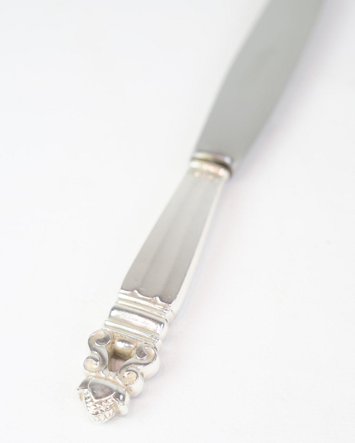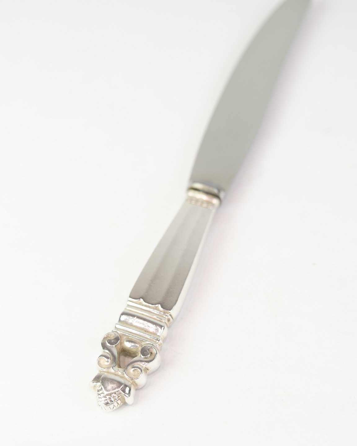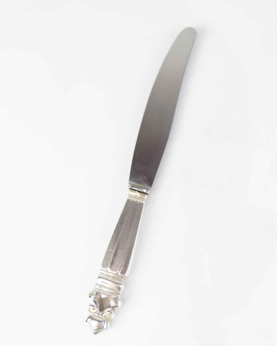 Georg Jensen middagskniv i Konge mønster. Kort skaft, sterling sølv og stål. Design af Johan Rohde 1915. Længde 24,5 cm.