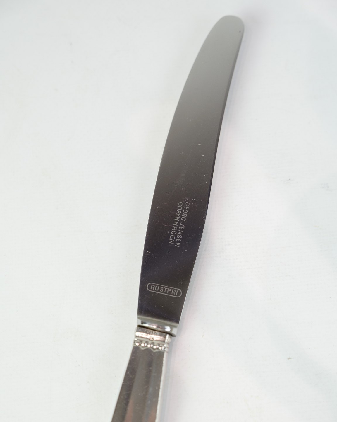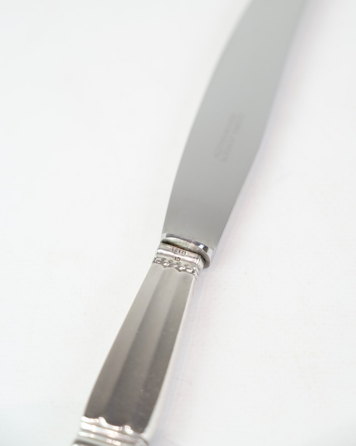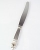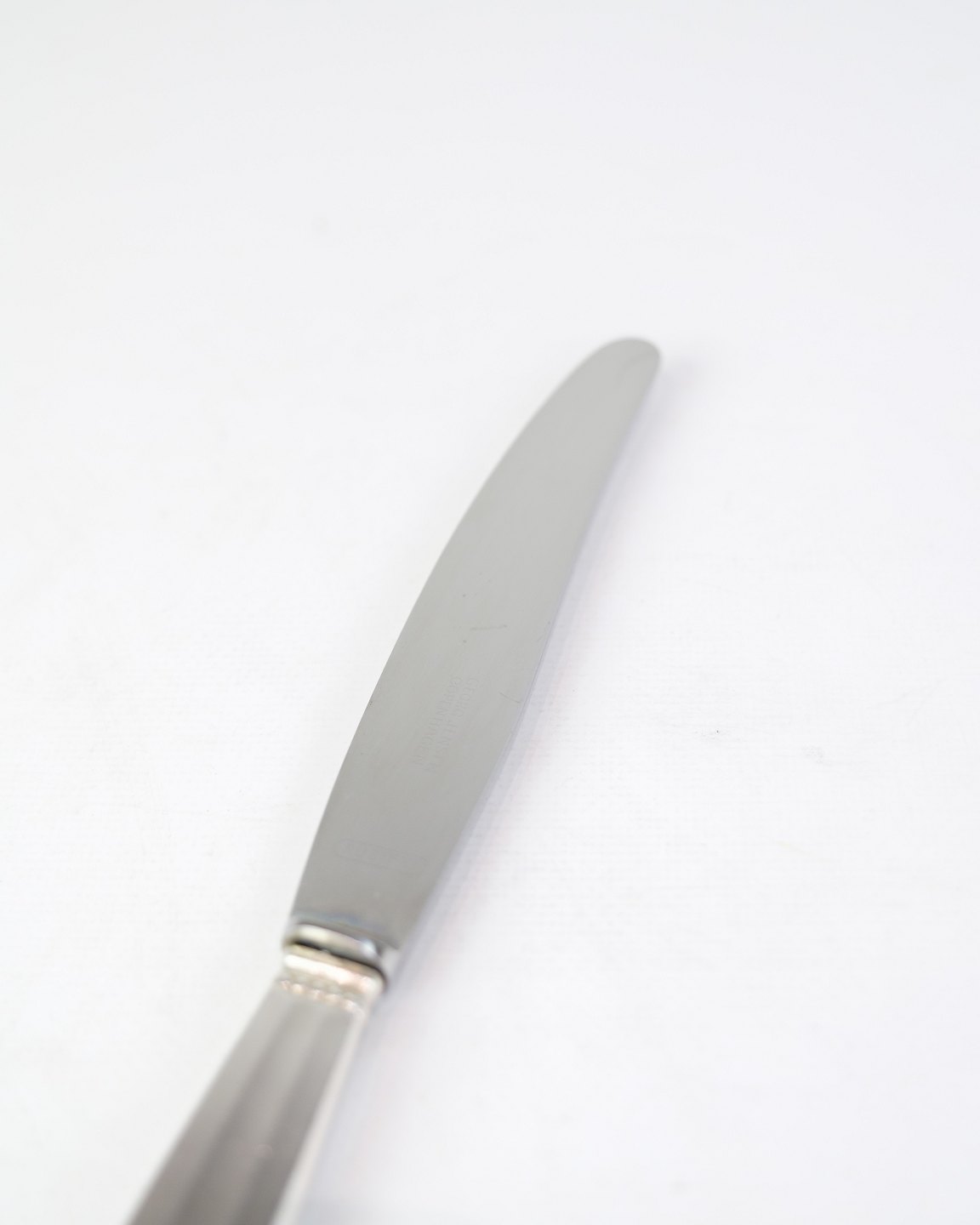 Georg Jensen middagskniv i Konge mønster. Kort skaft, sterling sølv og stål. Design af Johan Rohde 1915. Længde 24,5 cm.