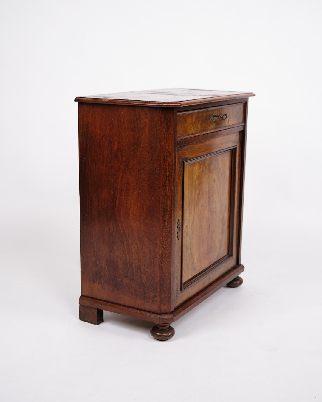 Lille antikt konsol-/entréskab fra 1880’erne. Mahogni og nøddetræ med runde ben.