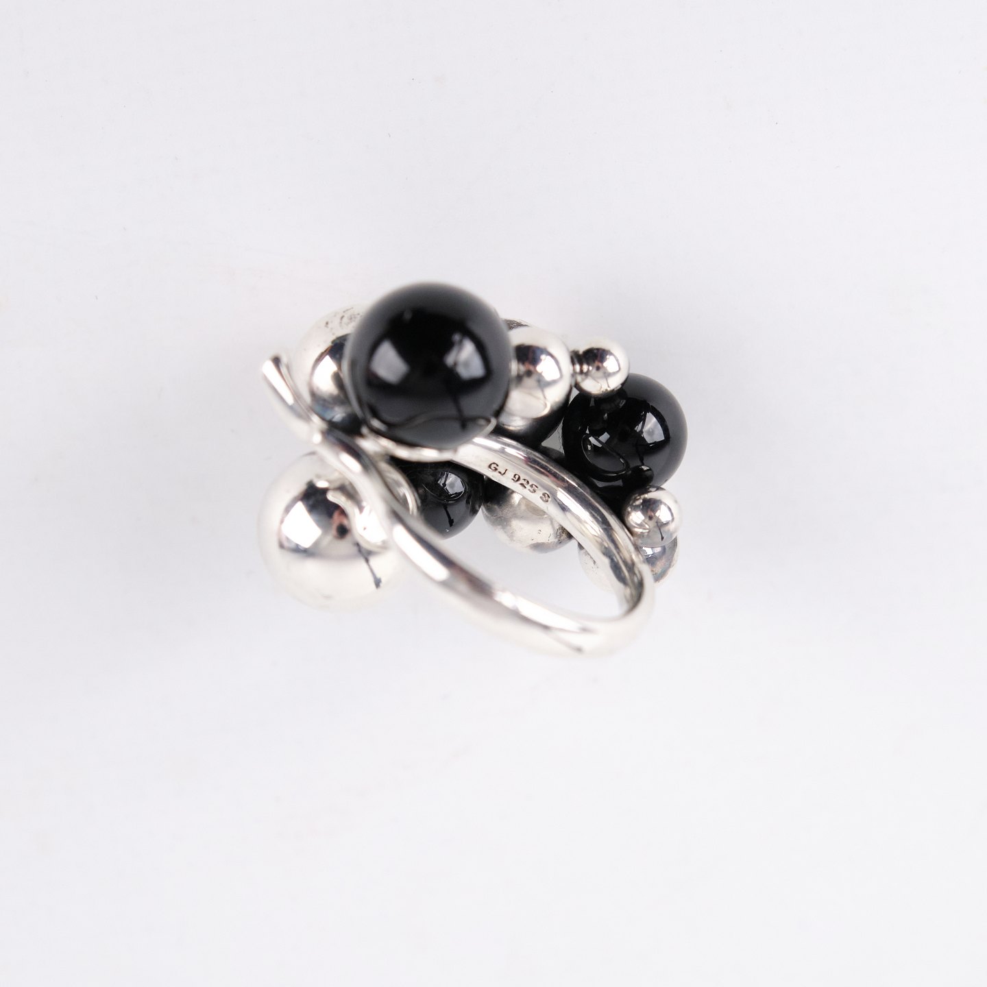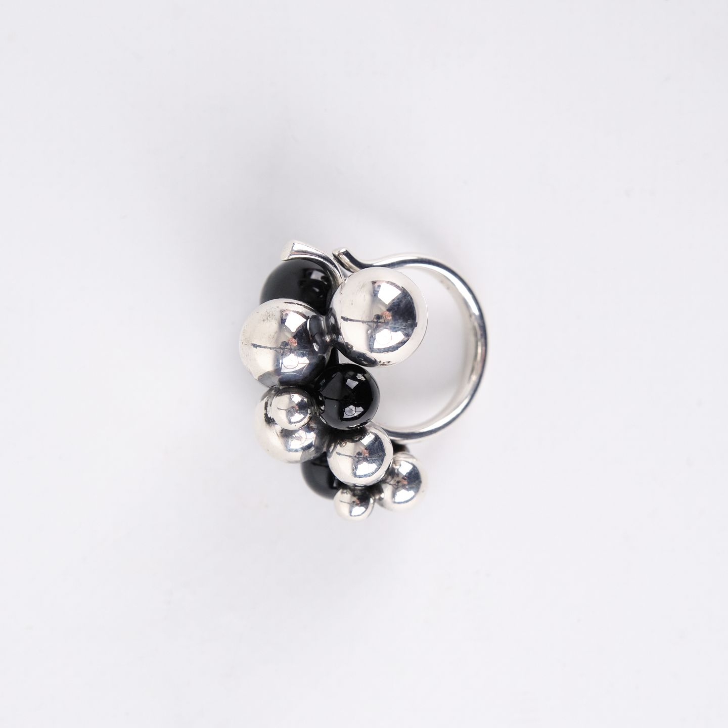 Georg Jensen ring i sterling sølv, model 54 fra Moonlight Grapes-kollektionen. Ringen har det karakteristiske drueornament, som måler 3 × 2,5 cm, og fremstår som et klassisk eksempel på Georg Jensens organiske formsprog. Elegant smykke udført i høj kvalitet.