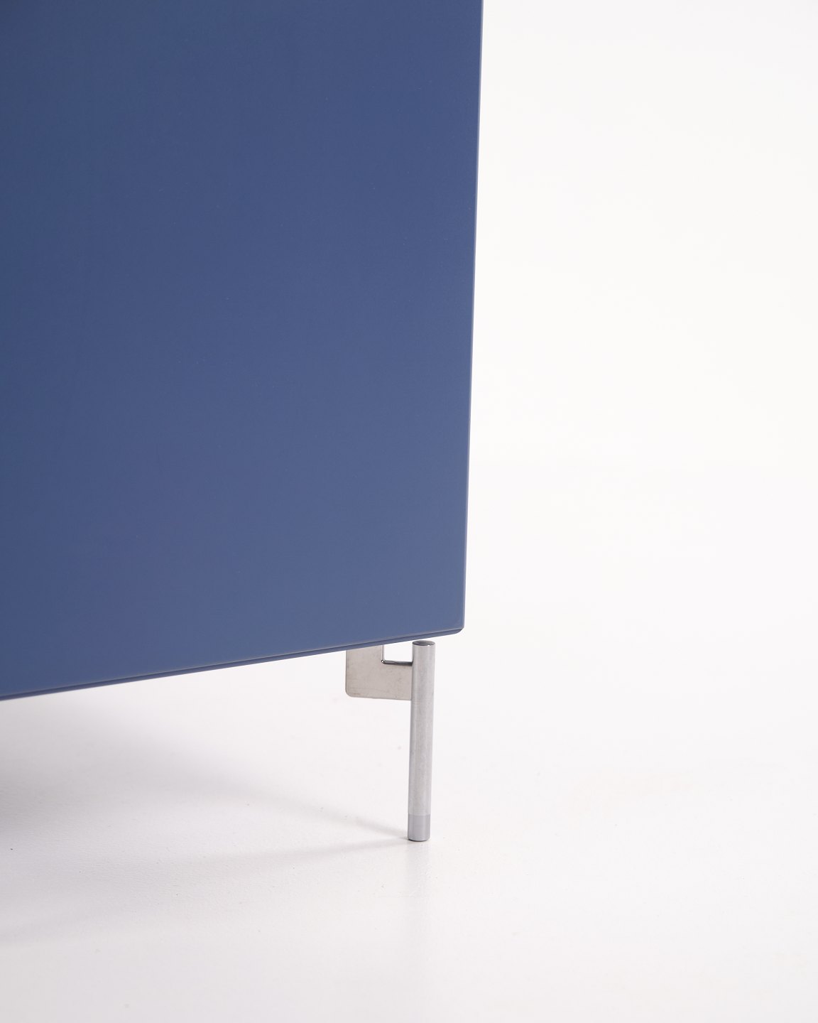 Montana kommode i blå med krom ben. Modulet er indrettet med tre skuffer og to låger, hvilket giver god og fleksibel opbevaringsplads. Klassisk Montana-design med enkel struktur og høj funktionalitet.