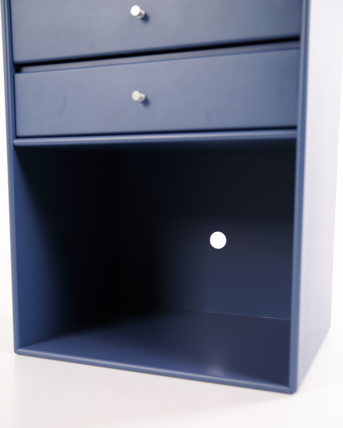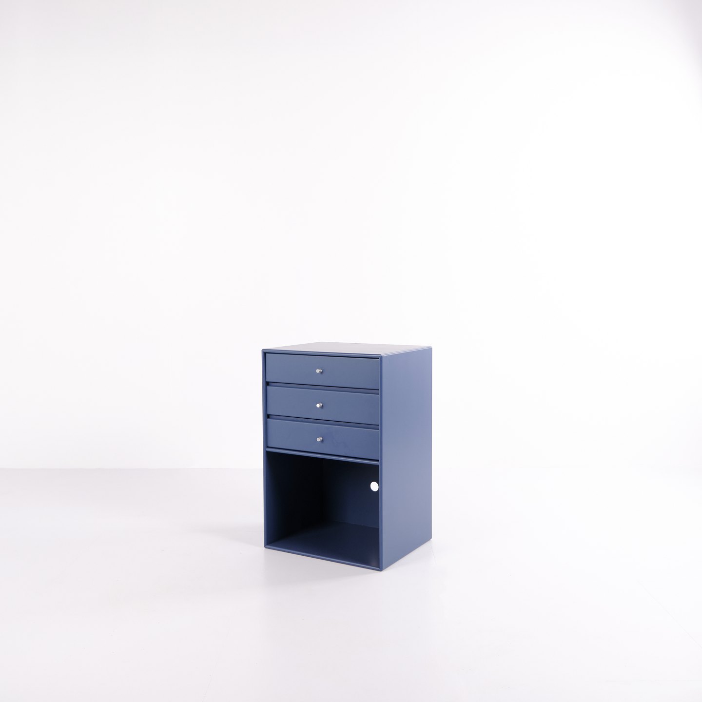 Montana reol i blå. Indrettet med tre skuffer og én åben hylde, velegnet til både opbevaring og display. Et klassisk Montana-modul, der kombinerer funktionalitet og enkelt design.