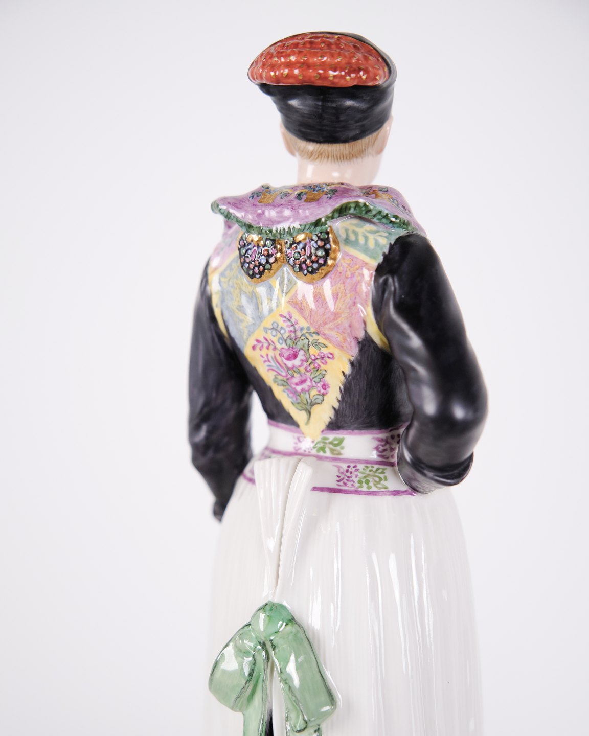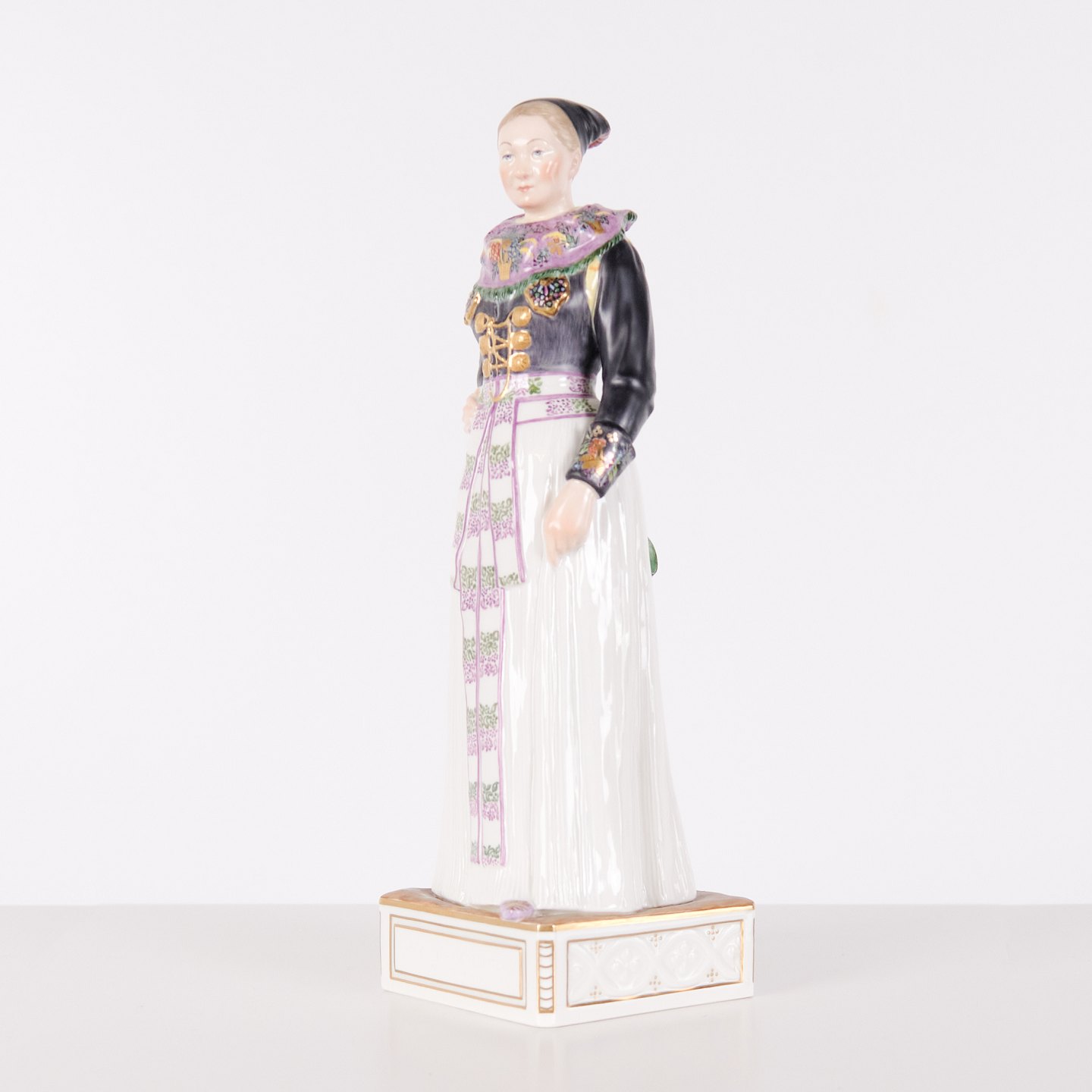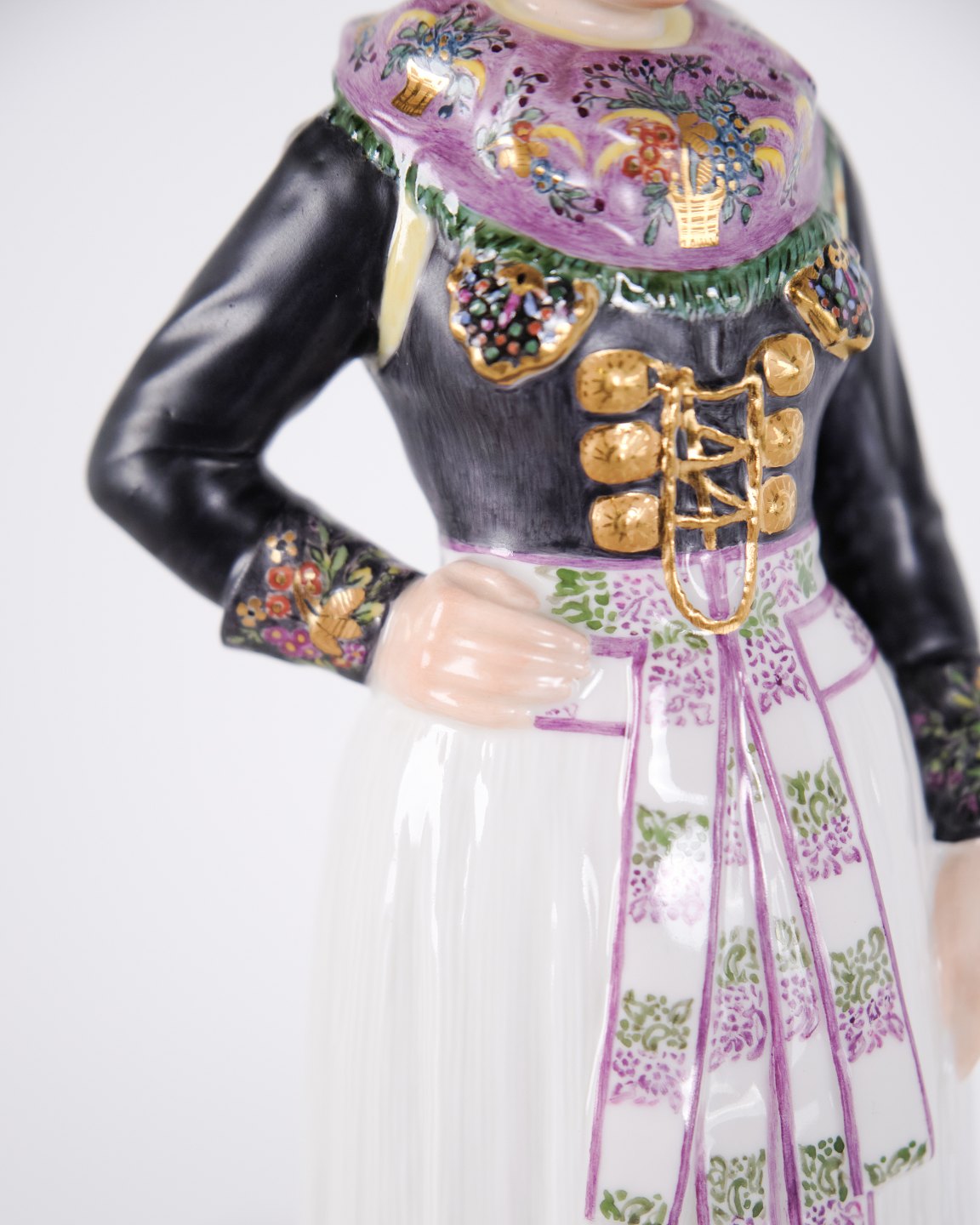 Überglasur-Porzellanfigur in dänischer Nationaltracht, Modell 12104, mit Darstellung einer Kochtracht aus Amager. Entworfen von Carl Martin-Hansen (1877–1941) für Royal Copenhagen und Teil der Serie Dänische Nationaltrachten.