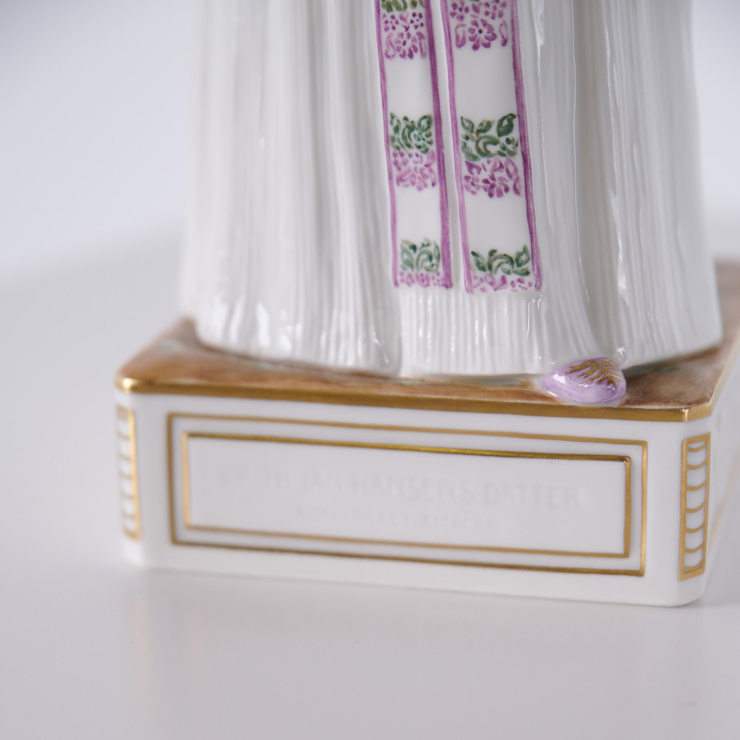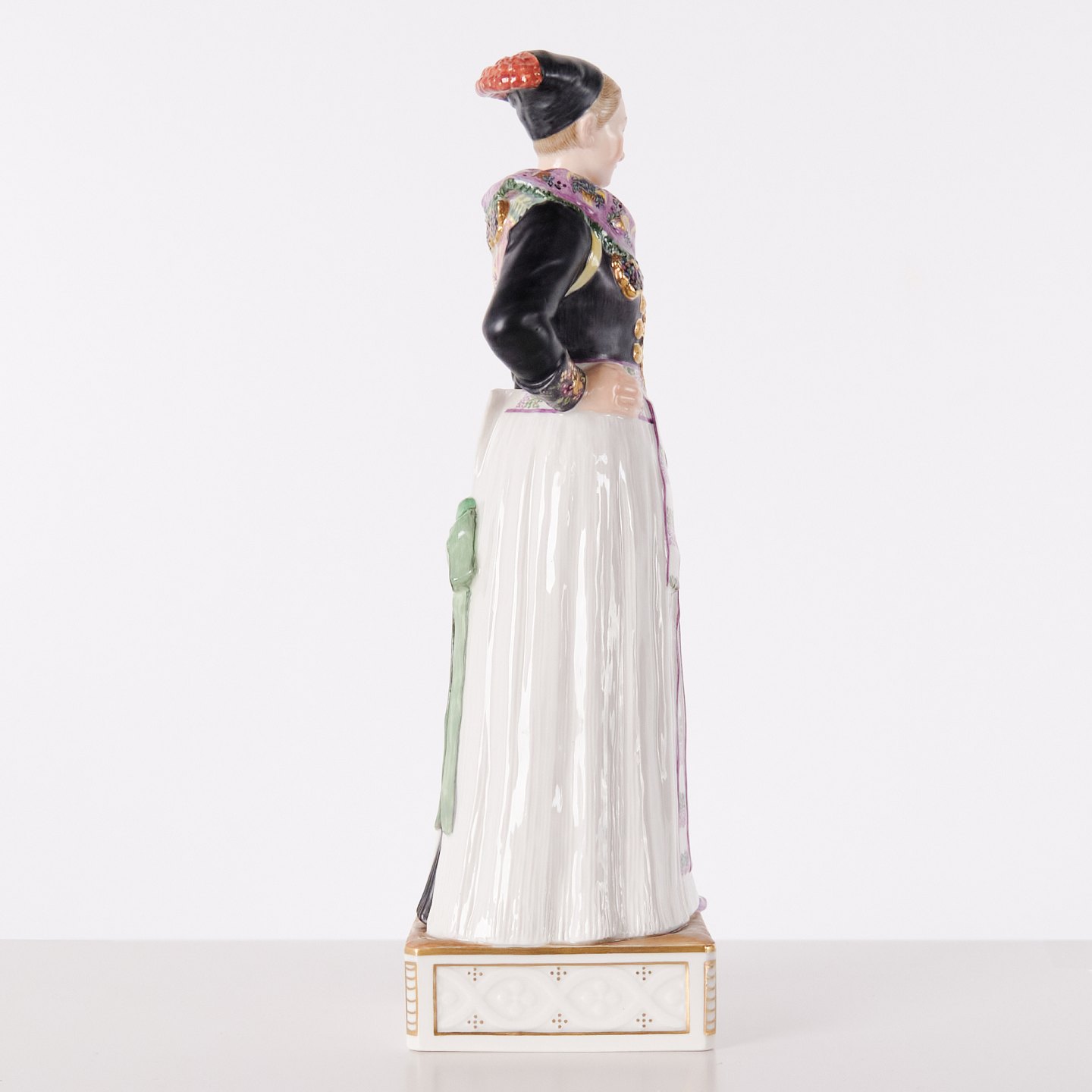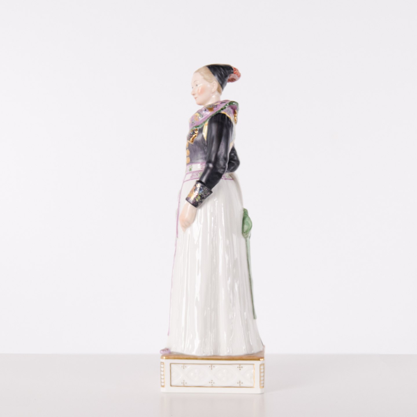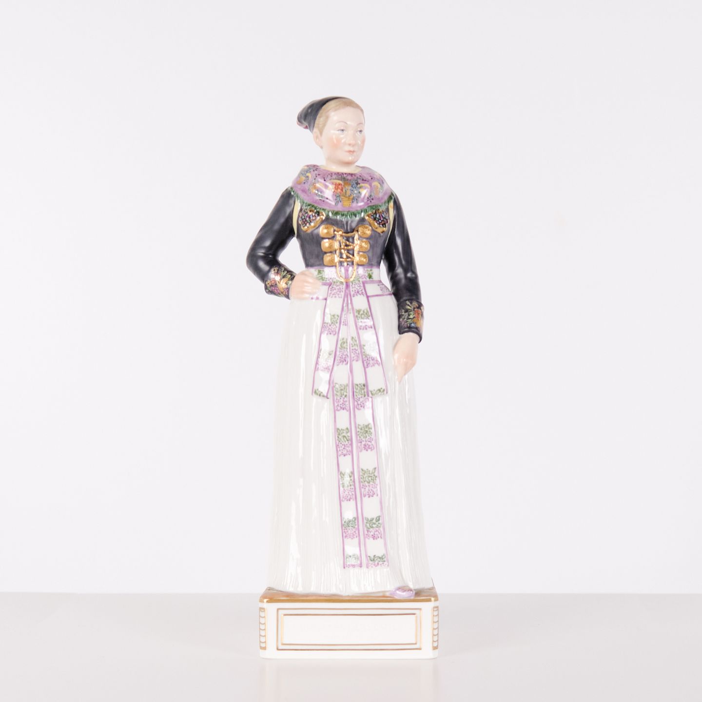Überglasur-Porzellanfigur in dänischer Nationaltracht, Modell 12104, mit Darstellung einer Kochtracht aus Amager. Entworfen von Carl Martin-Hansen (1877–1941) für Royal Copenhagen und Teil der Serie Dänische Nationaltrachten.