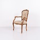 Nyrokoko armstol fra 1930’erne med buede ben og mønstret blomstret stof. Klassisk og dekorativt møbel i elegant stil.