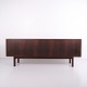 Skænken har to skydelåger med indfræsede greb i massivt palisander. Indvendigt findes fire udtræksskuffer samt hylder, som giver gode opbevaringsmuligheder og gør møblet velegnet til både stue og spisestue.