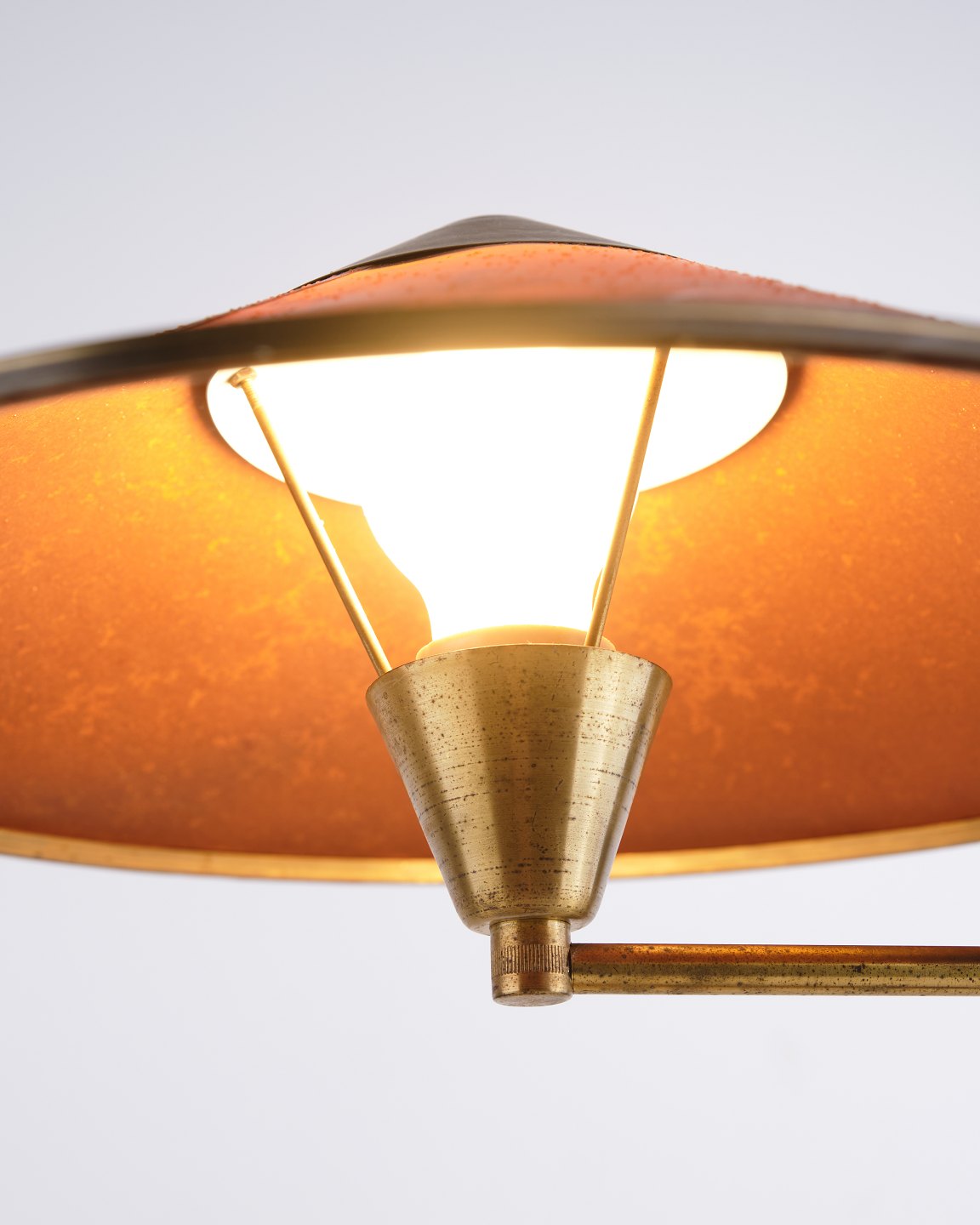 LYFA bordlampe fra 1930/40’erne i patineret messing med svingarm og original ravfarvet skærm i svinehud. Klassisk dansk belysning.