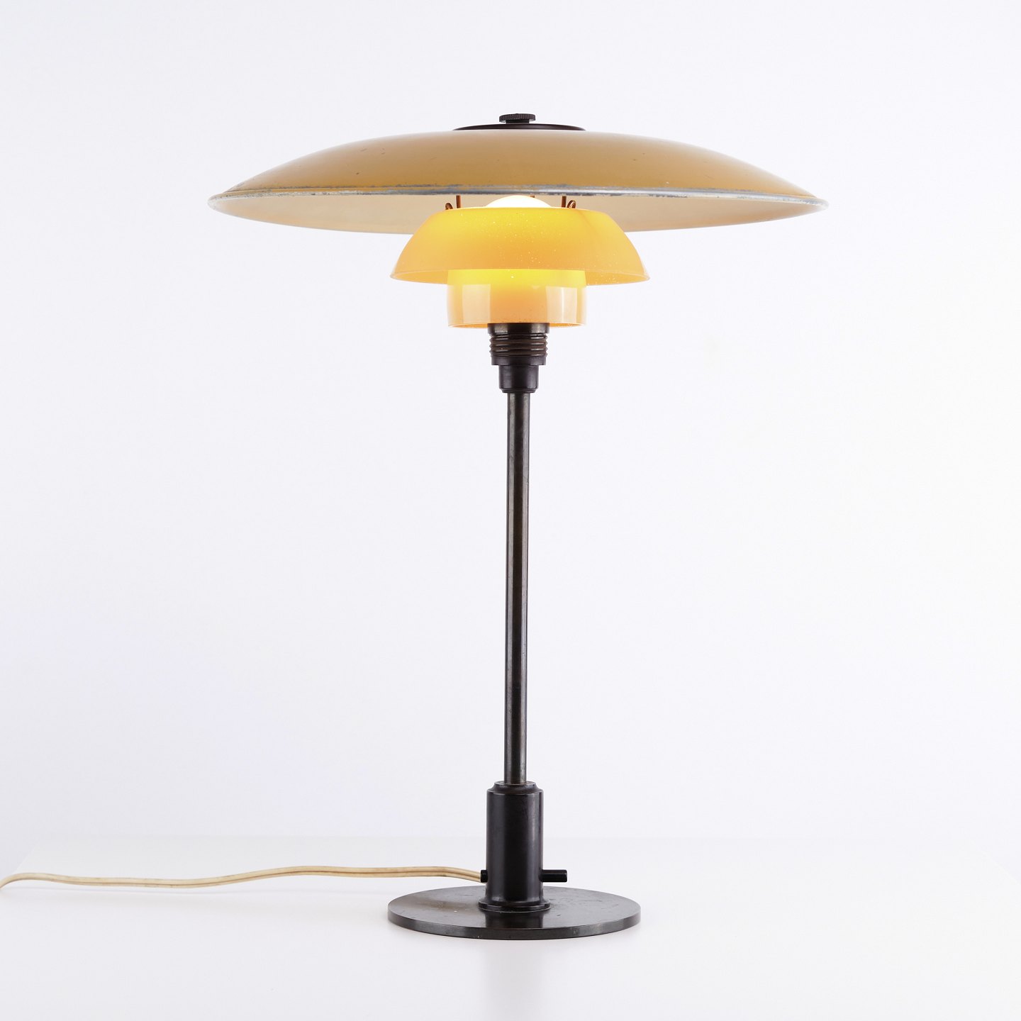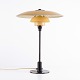 Sjælden PH 3,5/2,5 bordlampe designet af Poul Henningsen og fremstillet af Louis Poulsen i 1930’erne. Lampen har gulmalet metaloverskærm med stel i bruneret messing samt mellem- og bundskærme i 1-lags gulmalet opalglas.