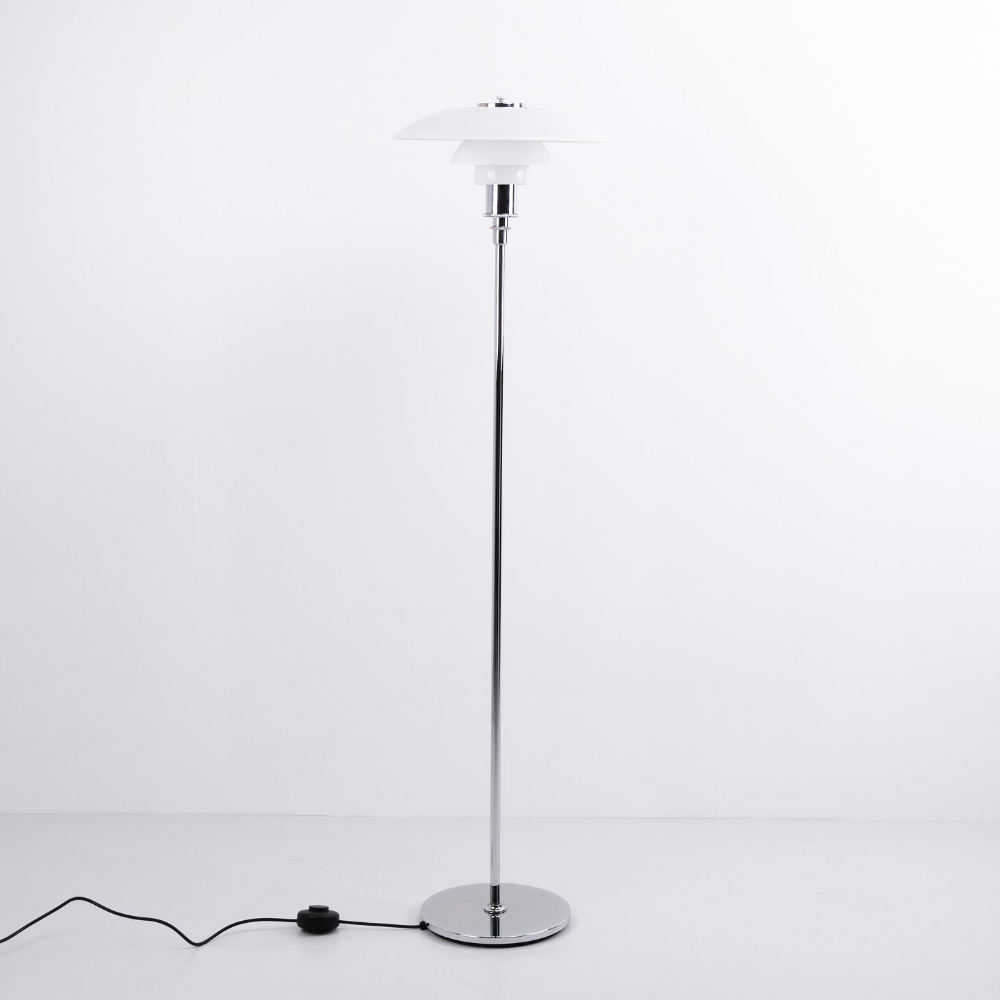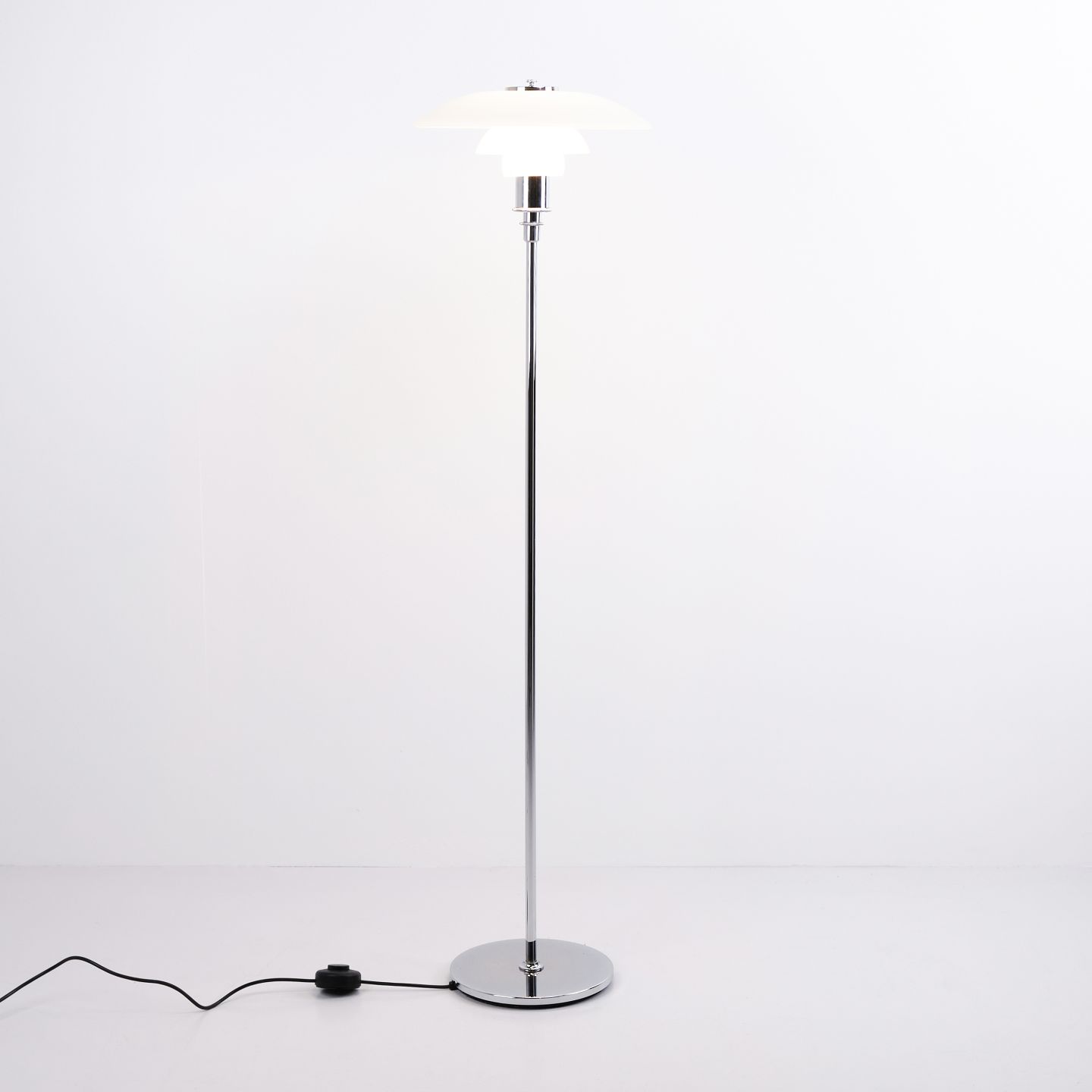 PH 3½-2½ gulvlampe i krom med opalglas fra Louis Poulsen. Designet af Poul Henningsen med klassisk dansk lysdesign og elegant udtryk.