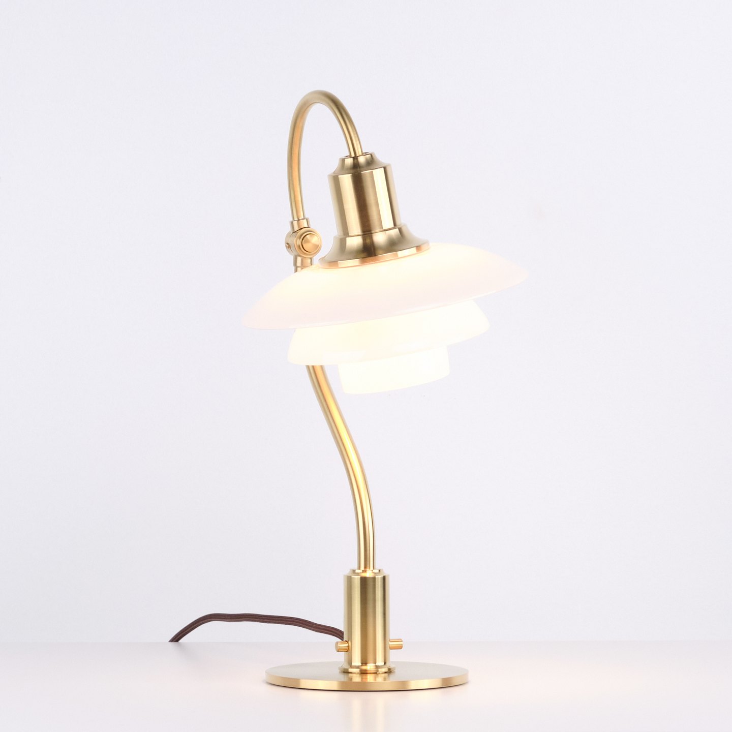 Eksklusiv PH 2/2 “Spørgsmålstegnet” bordlampe designet af Poul Henningsen og udgivet som Limited Edition i 2021 af Louis Poulsen. Lampen er udført i børstet messing med skærme i hvidt opalglas og har den karakteristiske buede form, som har givet modellen sit navn.