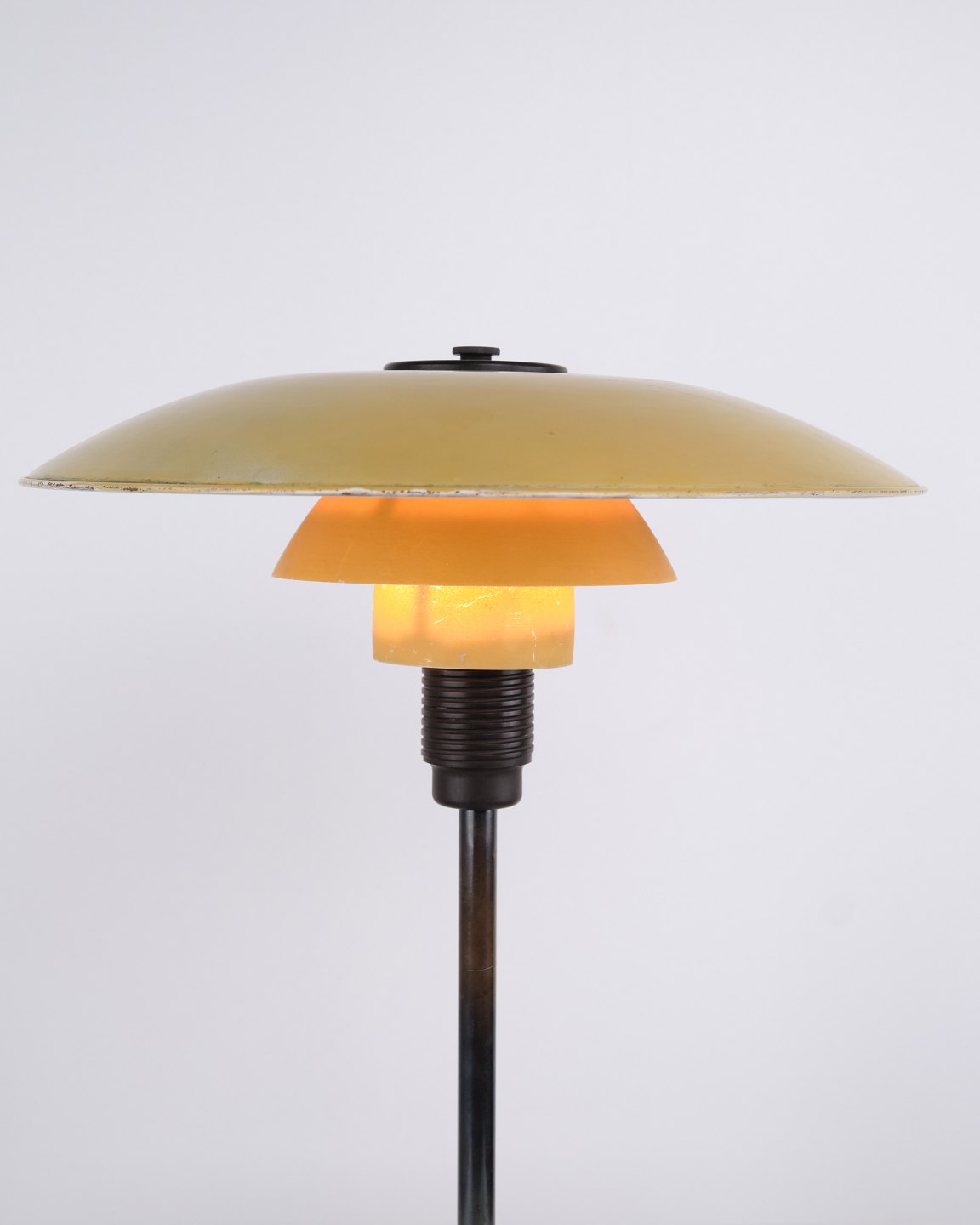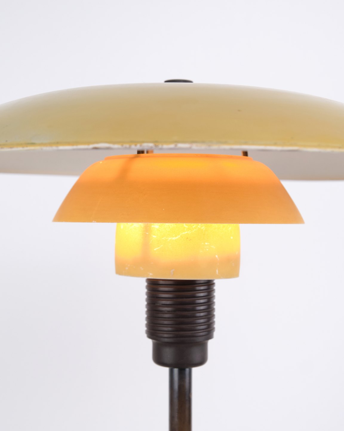 PH 3½/2½ bordlampe designet af Poul Henningsen og fremstillet af Louis Poulsen i 1930’erne. Lampen har gul metal overskærm samt mellem- og bundskærme i gulmalet opalglas, hvilket giver et varmt og karakterfuldt lys. Kombinationen af materialer og farver understreger lampens funktionelle og dekorative udtryk.