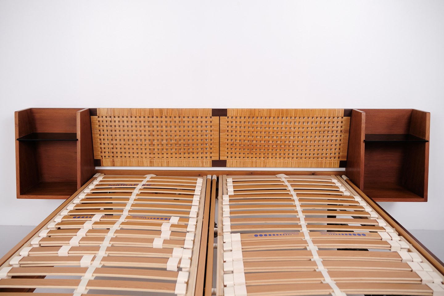 Model GE 701 dobbeltseng designet af Hans J. Wegner og fremstillet hos Getama i 1950’erne. Udført i fineret og massivt teaktræ. Gavle med sjeneflet og sort kunstlæder. Hovedgavl med integrerede sengeborde med hylder i sort glas samt underliggende hylde. Messingbeslag. Hans J. Wegner samarbejdede gennem mange år med Getama og udviklede flere møbler i teak til boligindretning og soveværelse.