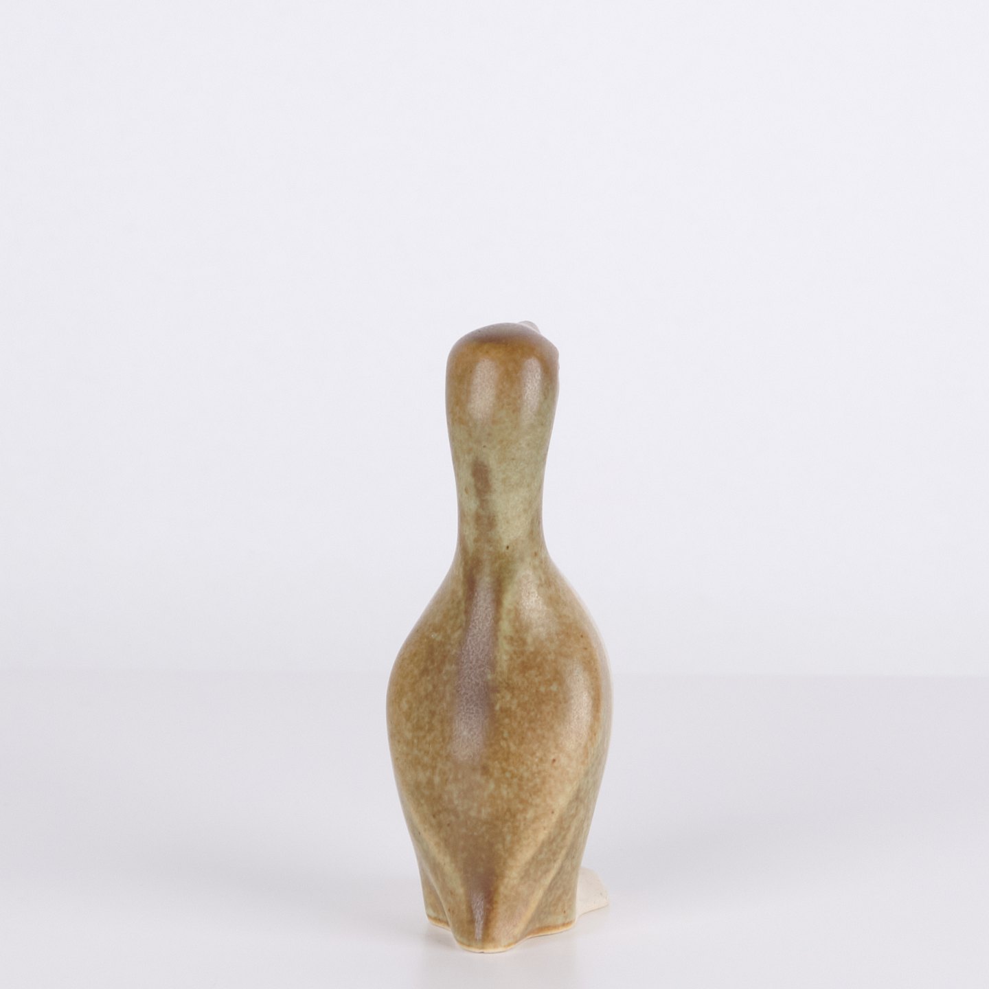 Keramisk pingvinfigur udført i glaseret stentøj fra 1960’erne. Figuren har enkel skandinavisk form med lyse glasurer og brun dekoration.