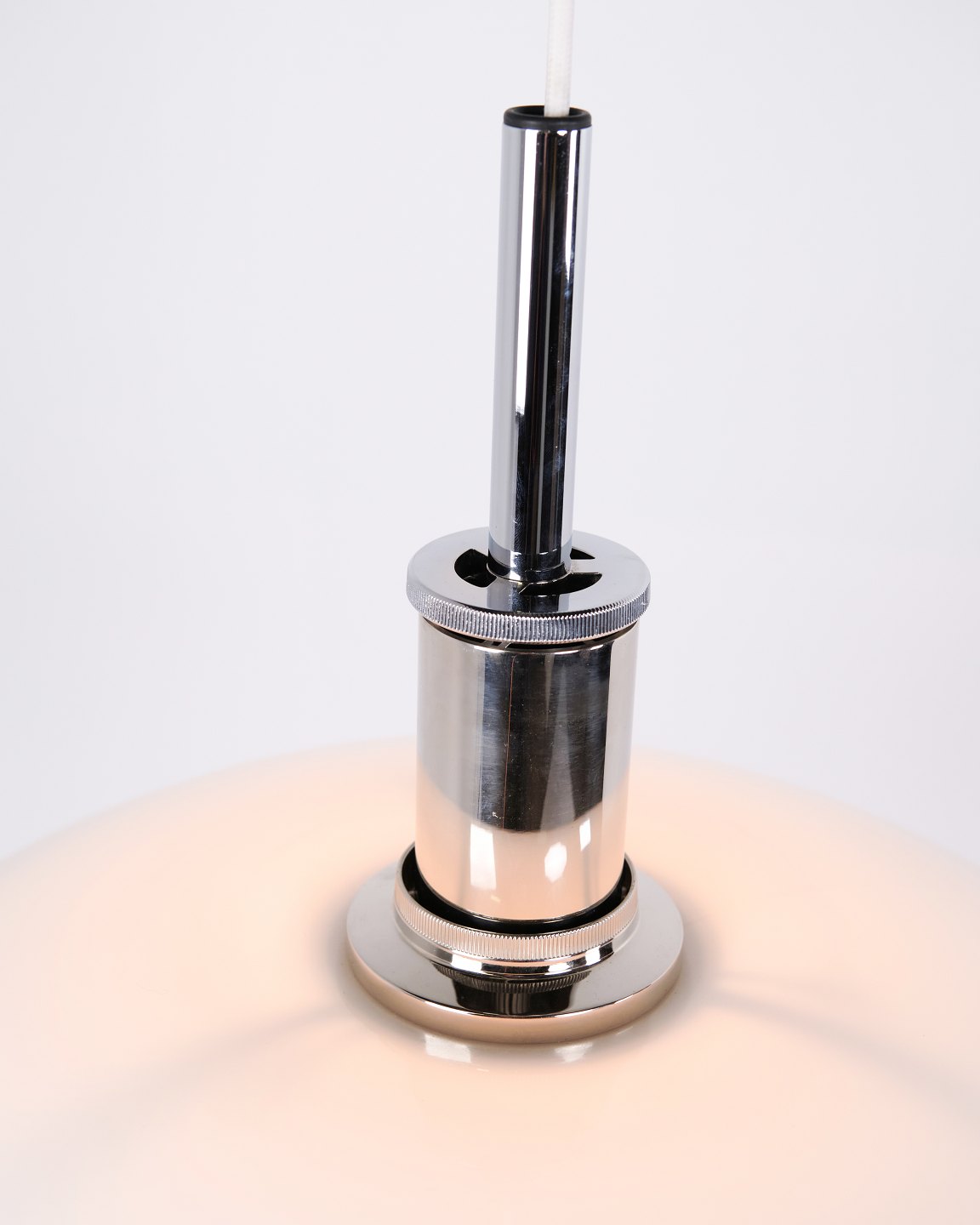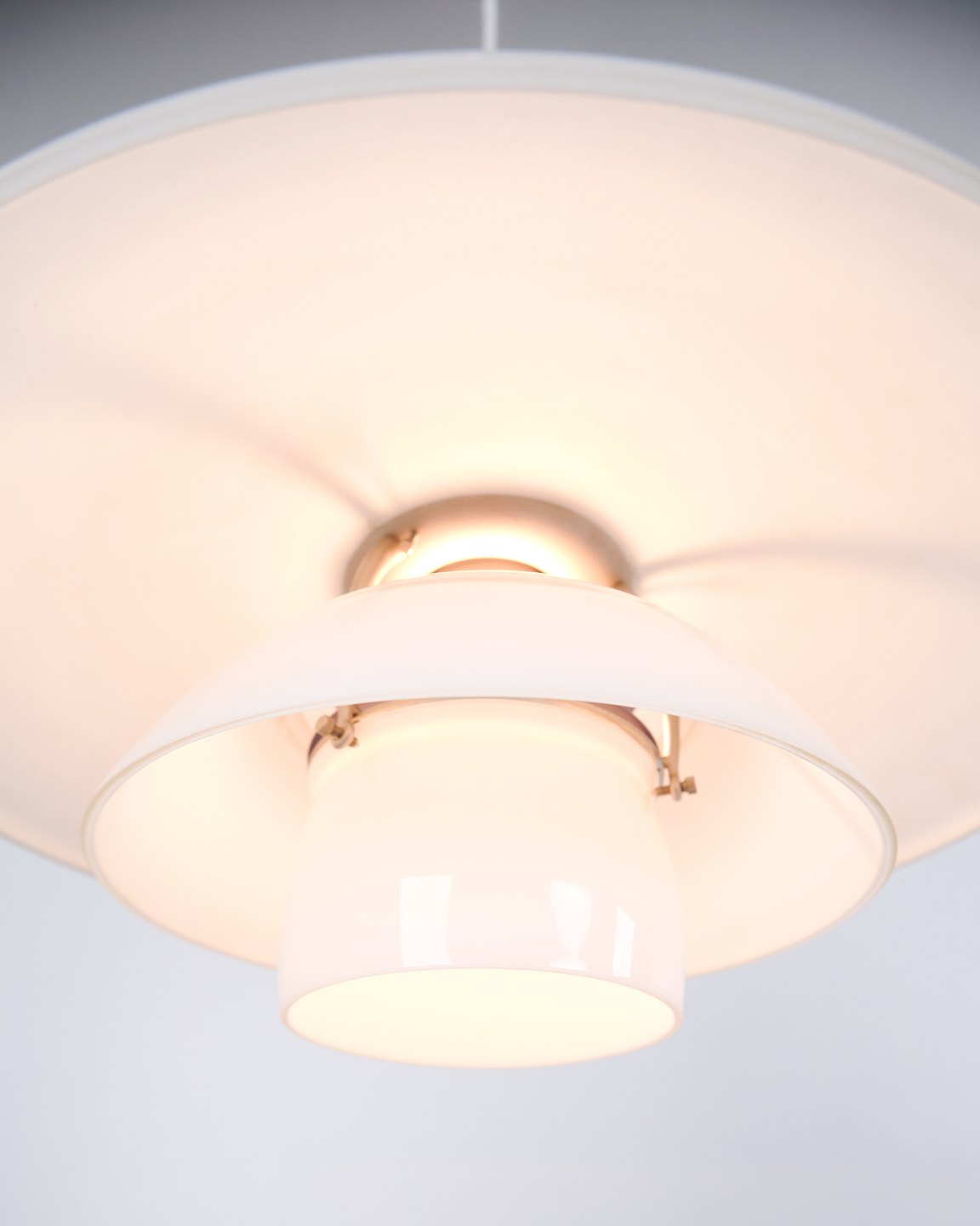 PH 4½-4 pendel designet af Poul Henningsen for Louis Poulsen. Lampen er udført med mundblæste treskærme i hvidt opalglas og kromophæng. Modellen har en overskærm på ca. 45 cm og anvender de nedre skærme fra PH 4/4-serien, udviklet for at give bredere lysfordeling ved lav ophængning over spisebord eller bordflade. Den nuværende version blev introduceret i 1980 og er en del af PH-seriens ikoniske blændfrie belysningssystem.