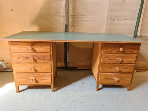 Skrivebord i fyrretræ og krydsfiner med laminat bordplade, fra 1980erne.