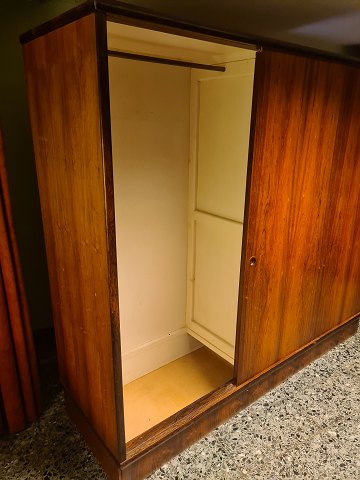 3 dørs skydelåge klædeskab fra 1960'erne i finéret palisander. Fremstår uden overskab, og med uoriginal bund i venstre side (billede) plus et par skruehuller ligeledes i venstre side. (Billede)
