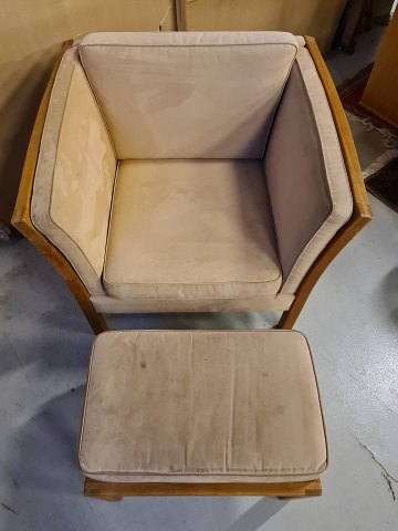 Lænestol og skammel i egetræ og kunst ruskind, fra 1990erne.