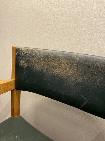 Armstol i eg med læderbetrukket ryg og sæde. Fremstår stabil og ok velholdt dog med lettere brugspor på læder. (billede)