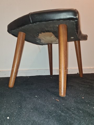 Læderbetrukket fodskammel med ben i teak. Fremstår stabil og ok pæn dog med manglende knap. (billede)