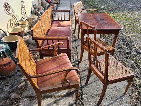 Salonstue i birk. Svensk produceret I 1930'erne. Bestående af: Bænk nr. 80448. 2 Armstole nr. 80449. 2 Salonstole nr. 80450 og Salonbord nr.80451. Nærmere beskrivelse af møblerne kan læses under de enkeltes varenummer.