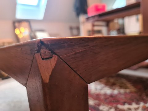 Severin Hansen sofabord fra 1970'erne I teak finér. Fremstår vakkelvornt og med en skade over det ene ben (billede) ellers ok pænt på overfladen.