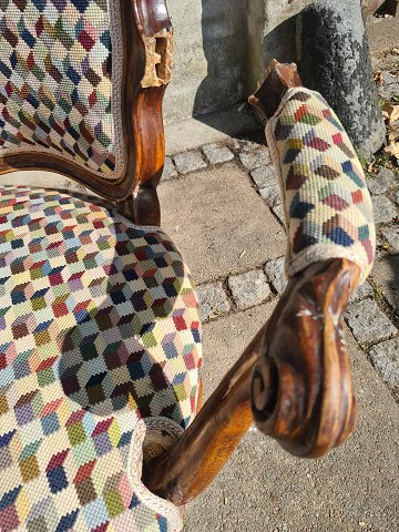 Rokoko stol fra starten af 1900 tallet i mahogni og broderet sæde, ryg og armlæn. Fremstår pæn og med udmærket stabile ben, men med et defekt armlæn. (billede)