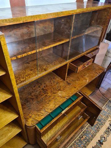 Funkis inspireret dækketøjsskab fra 1940'erne I birk og med glas skydelåger. Fremstår pænt, velholdt og udmærket funktionsdygtigt. Dog mangler en nøglehulskrans på skabsågen. (Billede)
