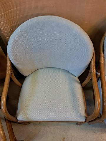 3 Stole, en fodskammel og lille bord i bambus, af nyere dato.