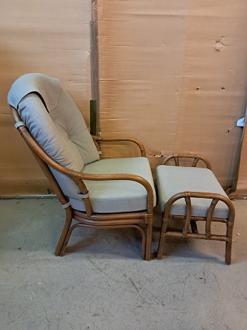 3 Stole, en fodskammel og lille bord i bambus, af nyere dato.