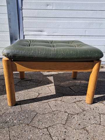 Skammel i massivt egetræ med læderhynde, fra 1980erne.