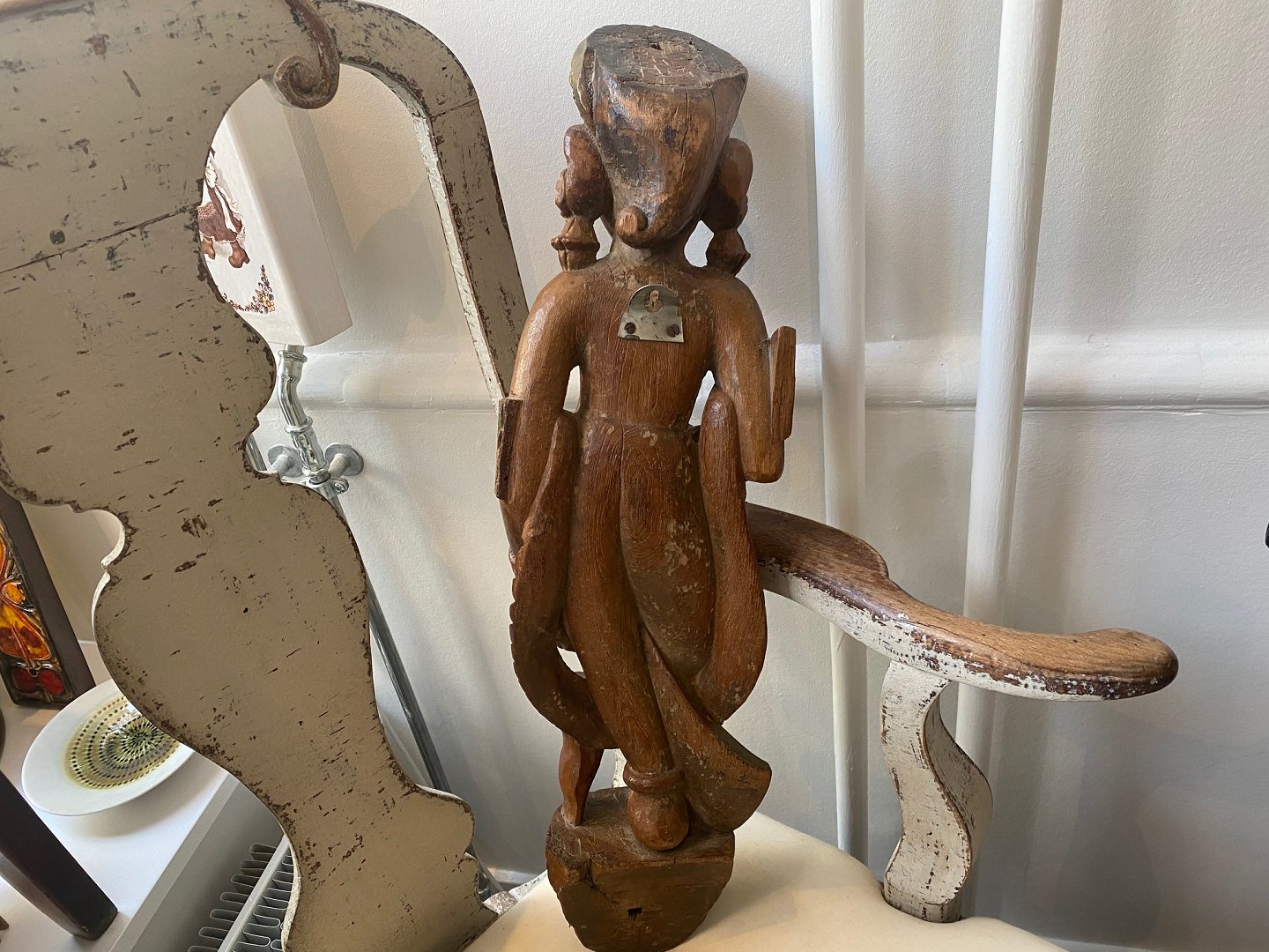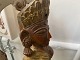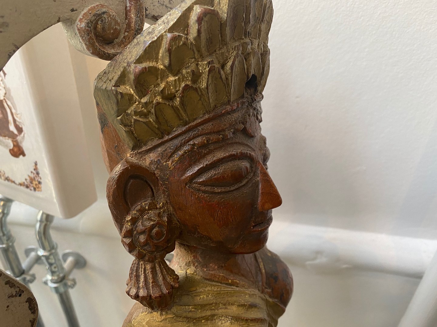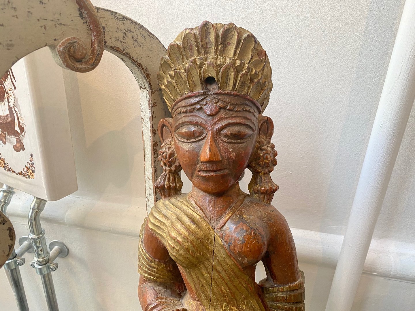 Udskåret træfigur med forgyldninger. Formentlig hindu gudinde. Gudinder i hinduismen er den guddommelige repræsentation af kosmos, og de er komplementære til deres mandlige kolleger. Både de maskuline og de feminine guddomme fuldender universets guddommelighed. Følgende er kendte kvindelige hindu gudinder: Radha, Kamadhenu, Tulsi, Ganga, Sita, Kali, Seraswati, Lakshmi, Parvati og Durga.