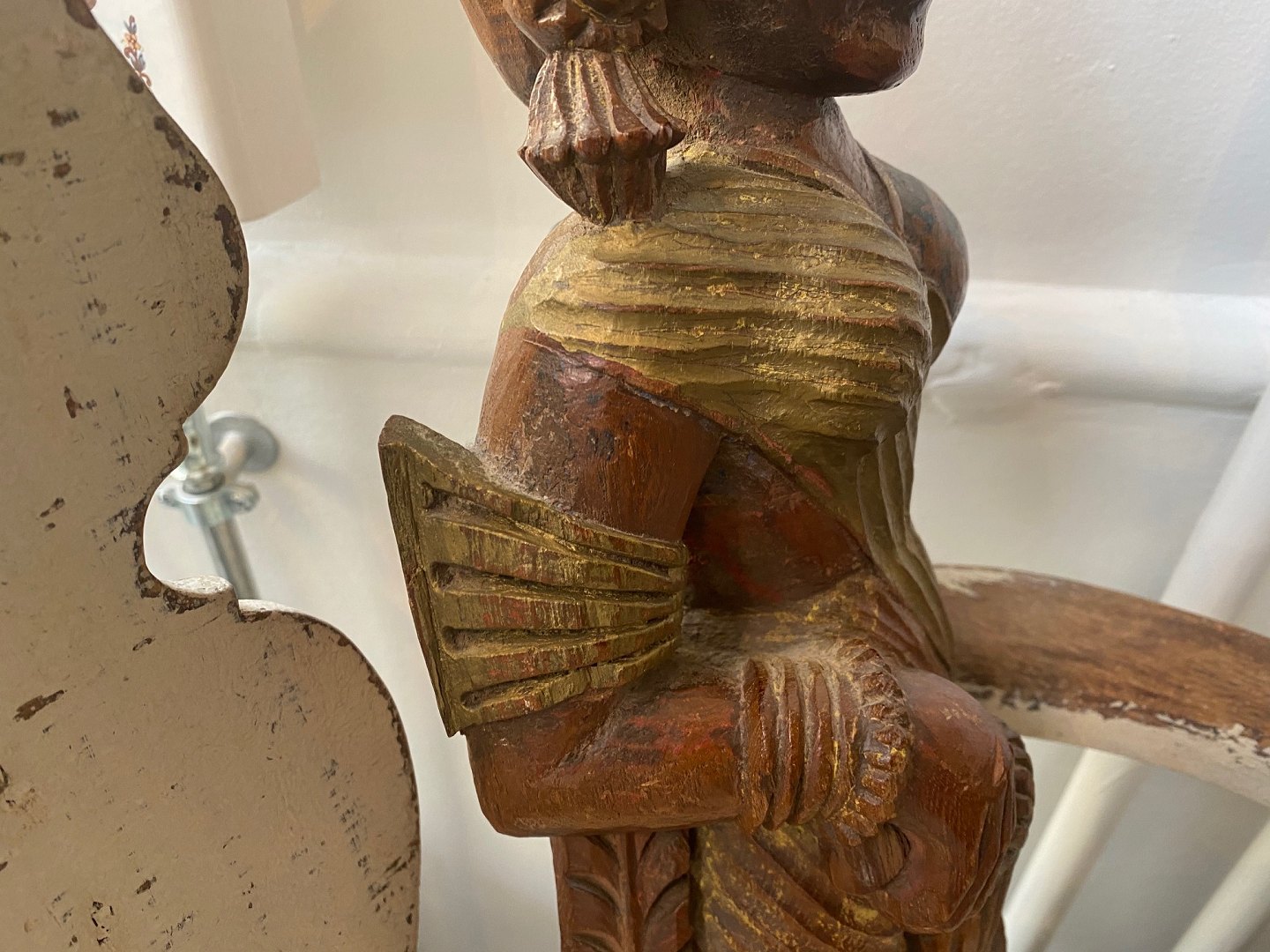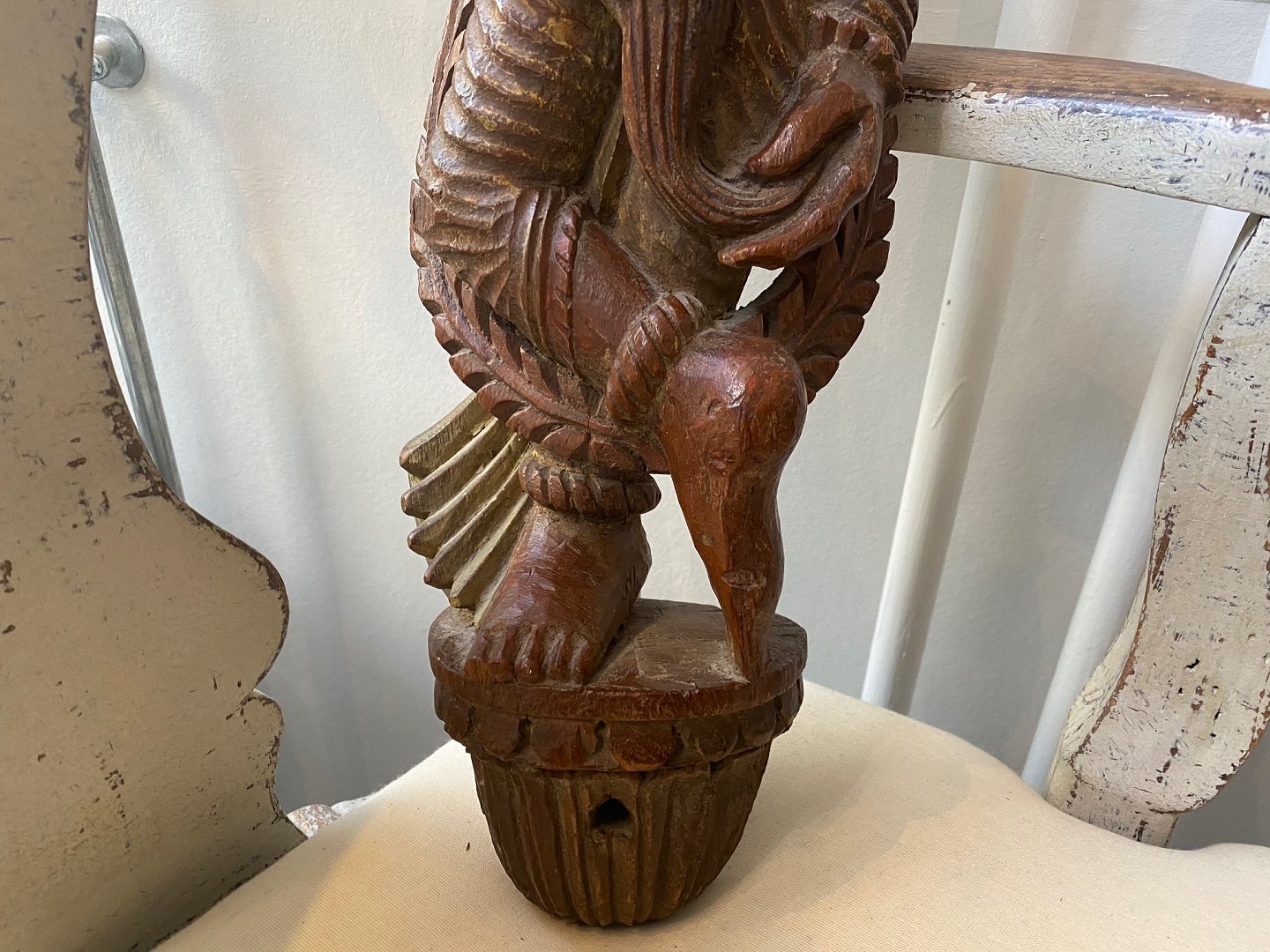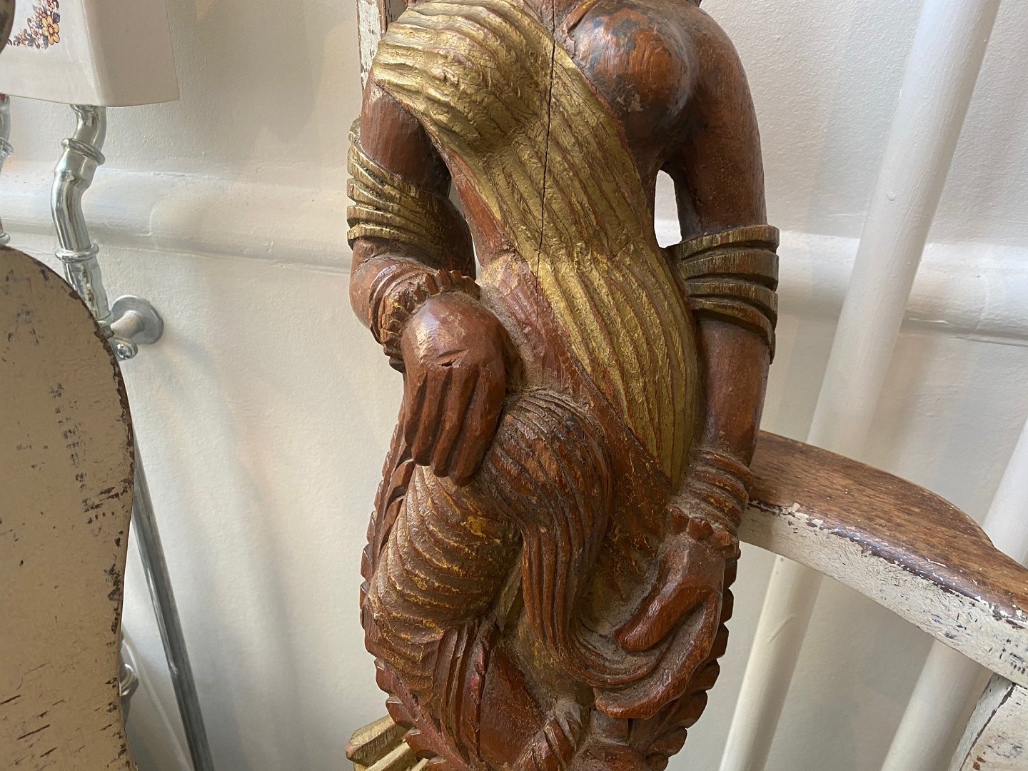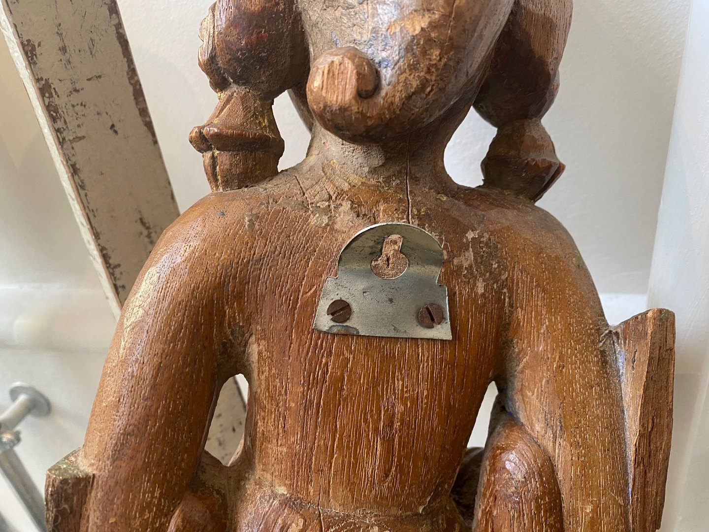 Udskåret træfigur med forgyldninger. Formentlig hindu gudinde. Gudinder i hinduismen er den guddommelige repræsentation af kosmos, og de er komplementære til deres mandlige kolleger. Både de maskuline og de feminine guddomme fuldender universets guddommelighed. Følgende er kendte kvindelige hindu gudinder: Radha, Kamadhenu, Tulsi, Ganga, Sita, Kali, Seraswati, Lakshmi, Parvati og Durga.
