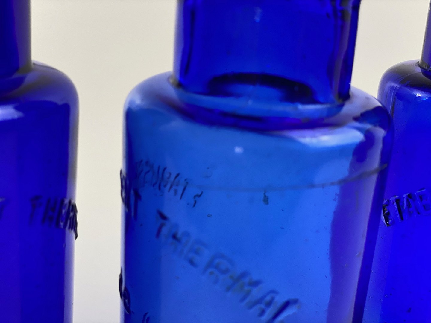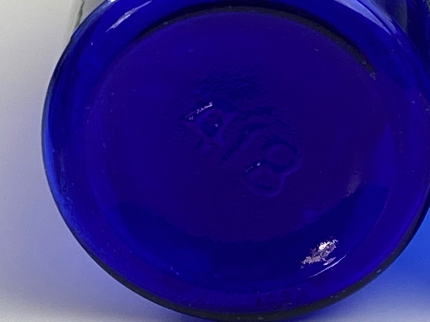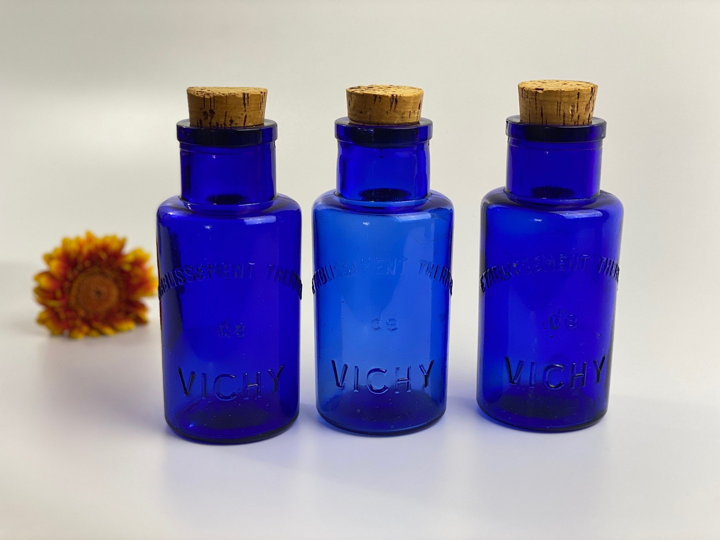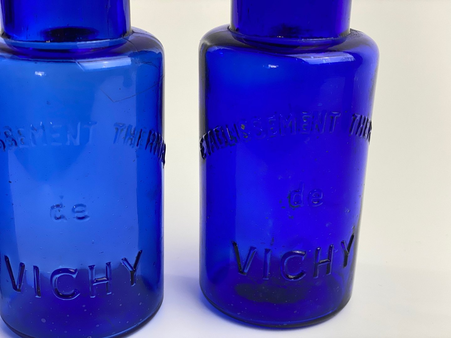 Antik, fransk, koboltblå glasflaske fra Etablissement Thermal de Vichy (2 flasker tilbage)