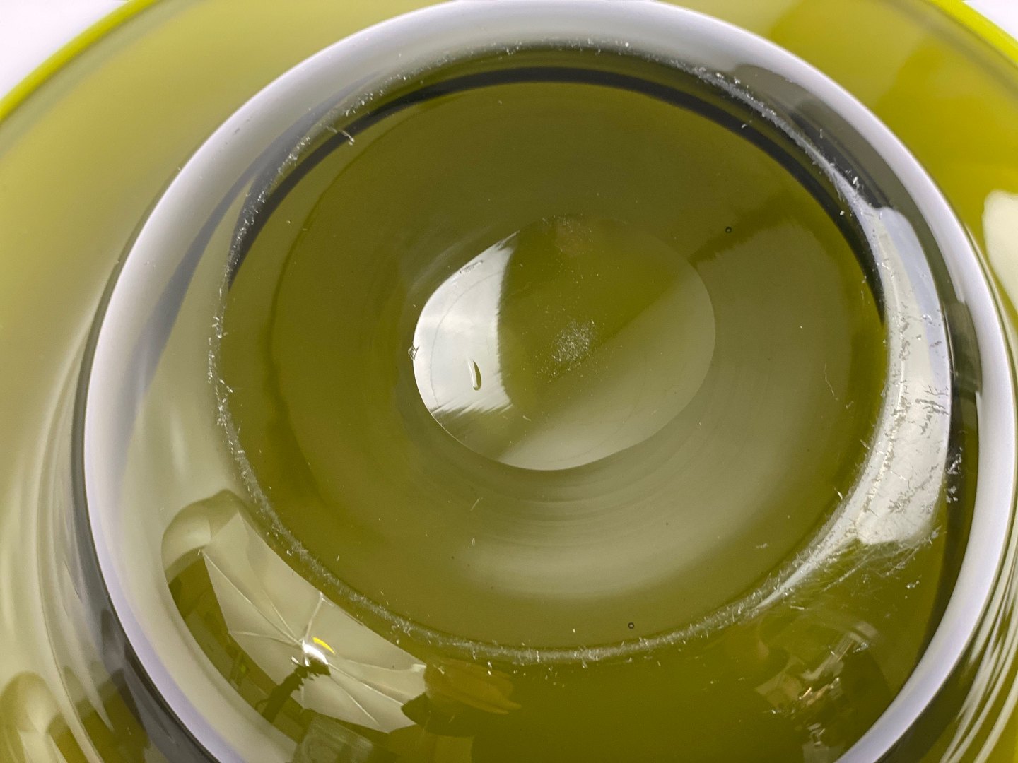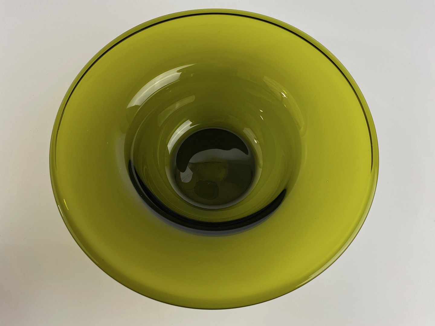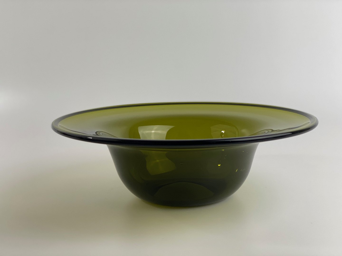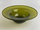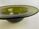Fin, gammel, hatteformet skål / fad af mosgrønt glas