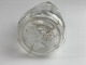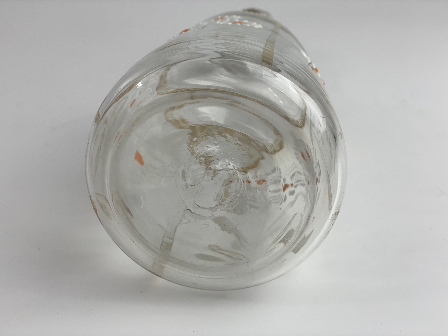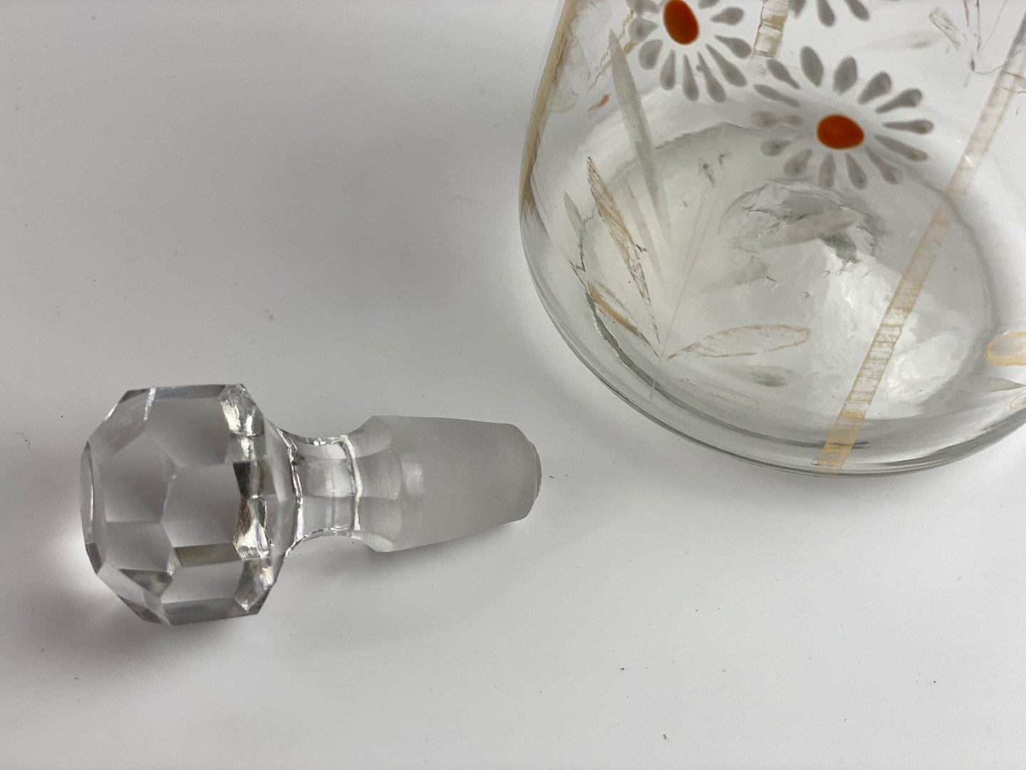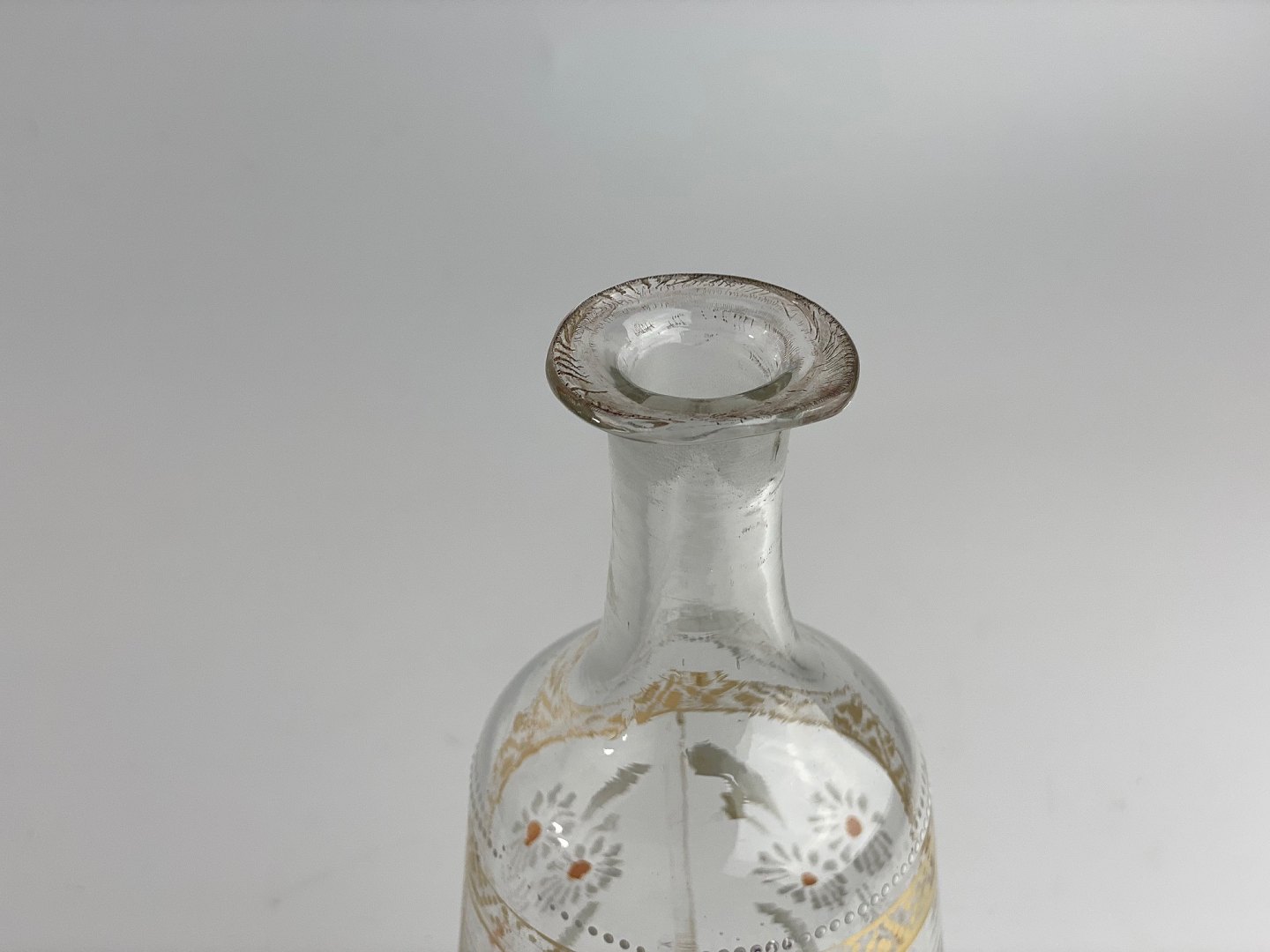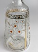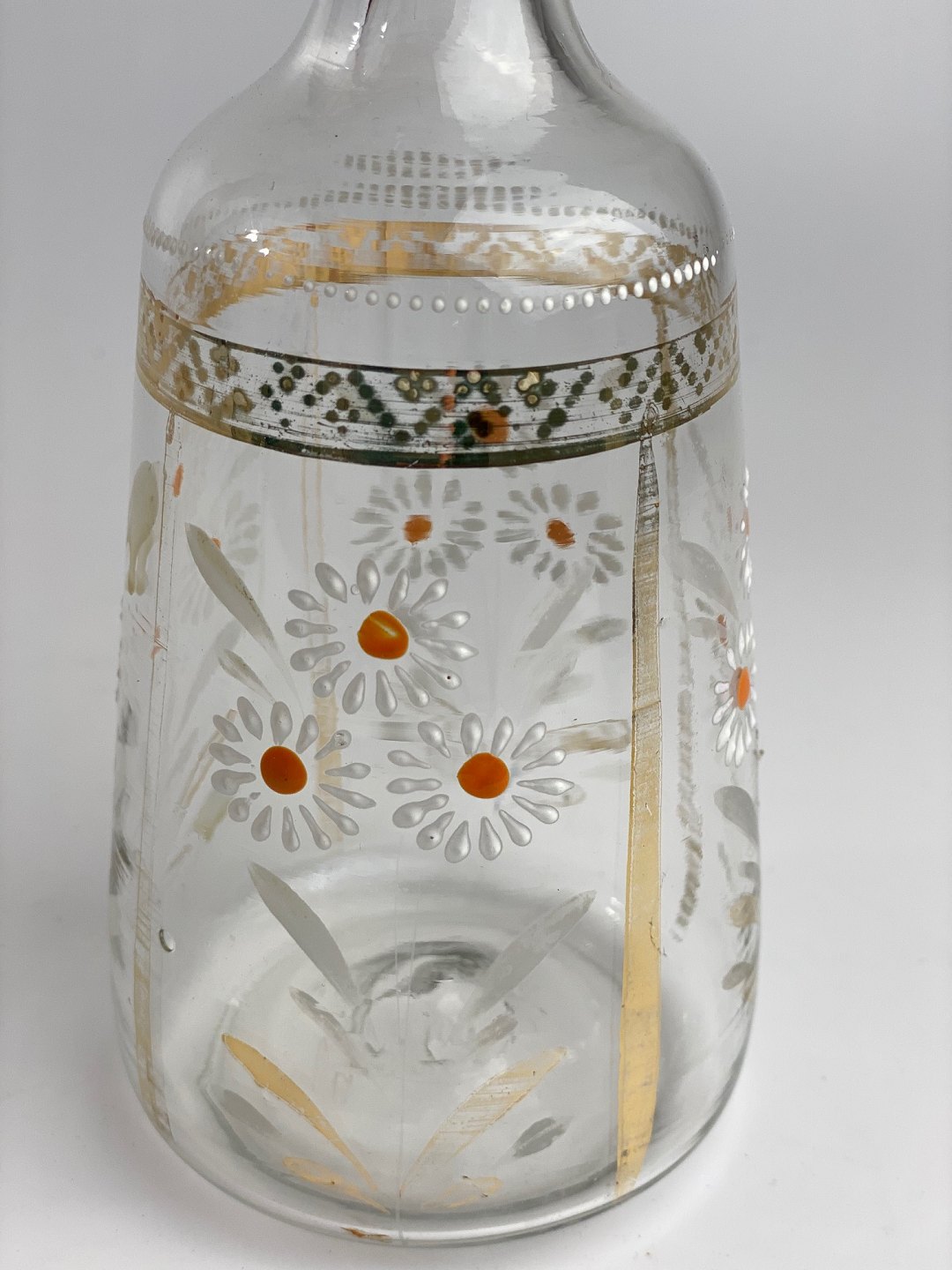 Smuk, lille, antik karaffel i klart glas. Emaljemalet i hvidt, gul og guld med motiv af marguritter