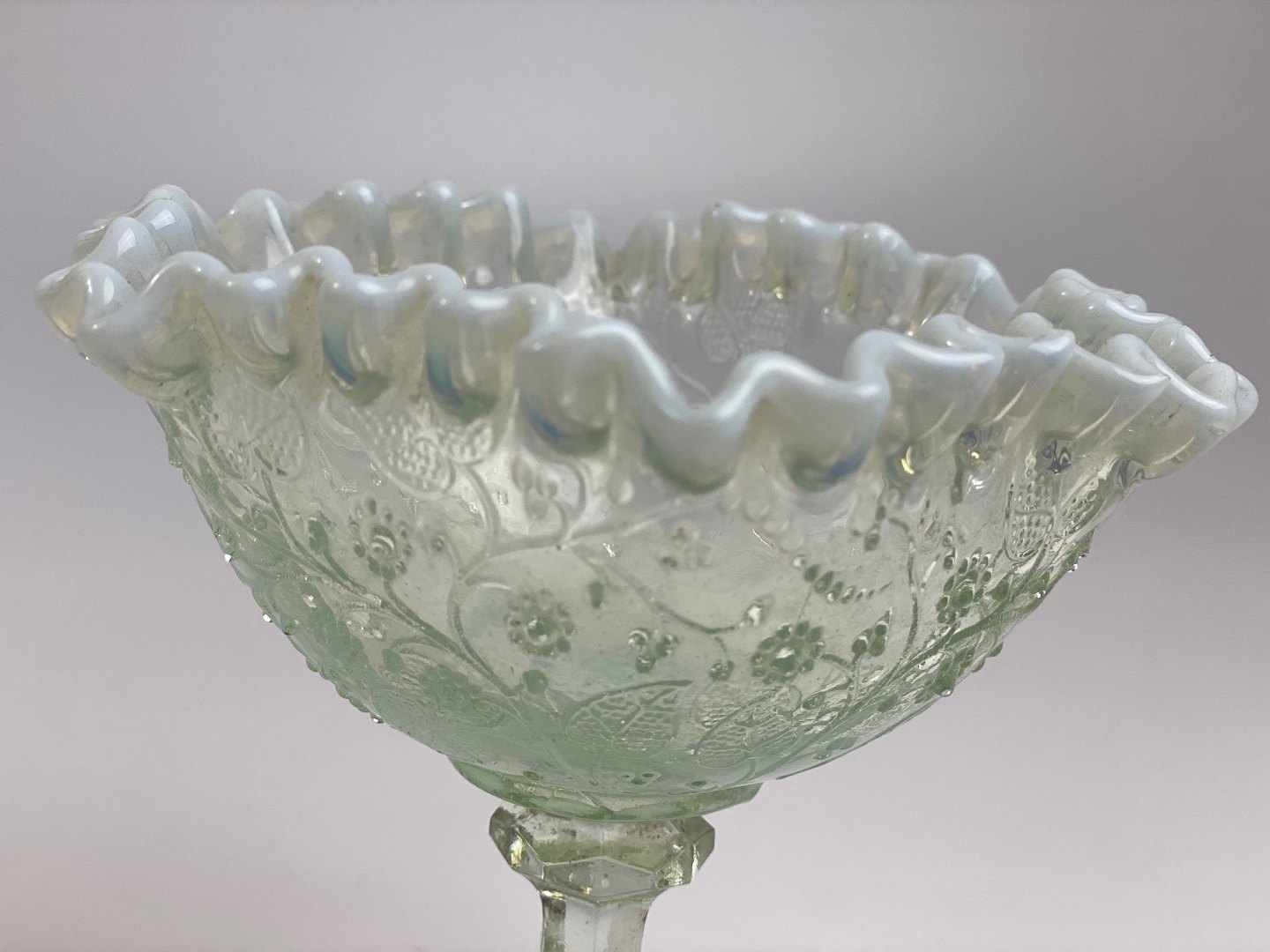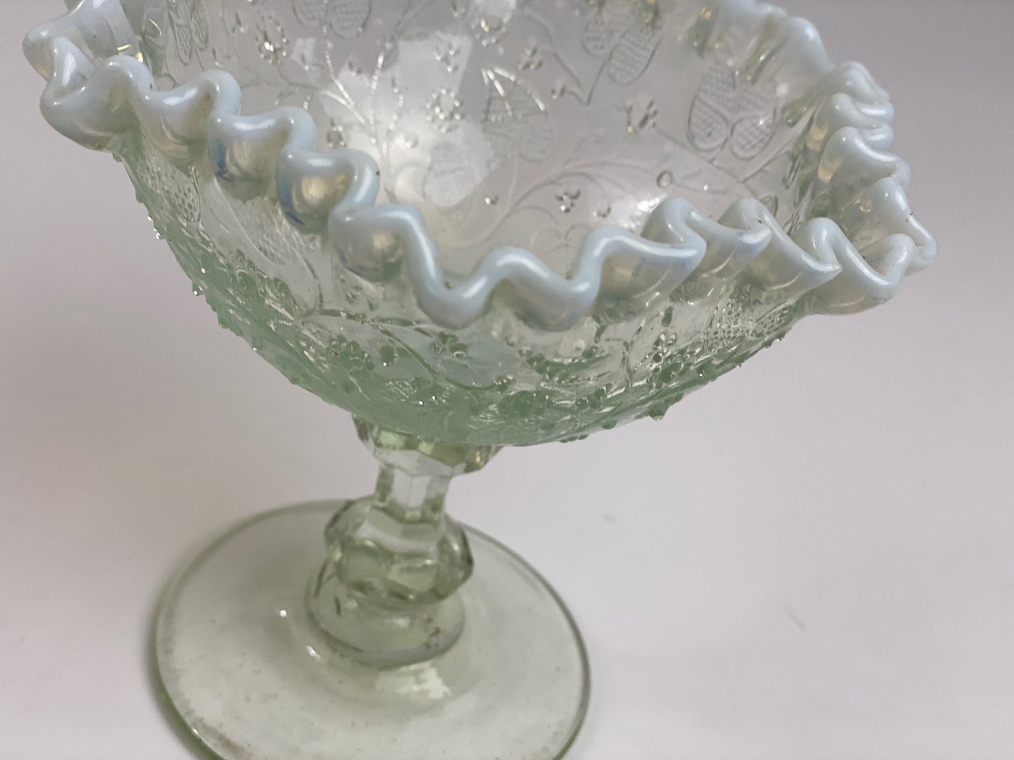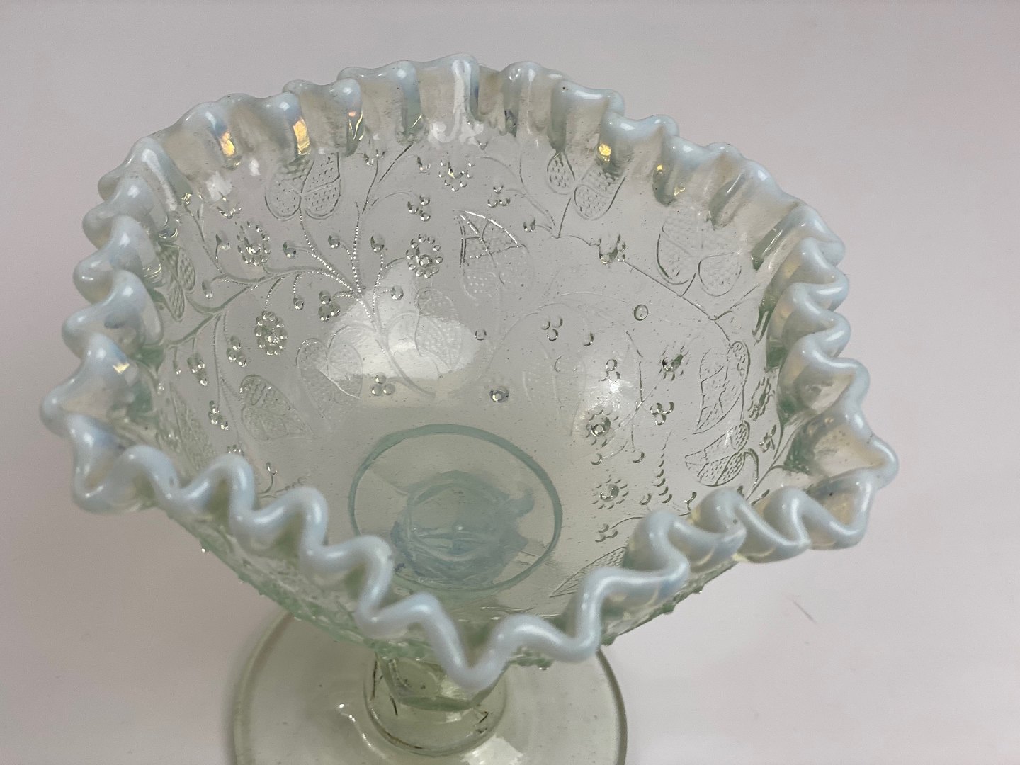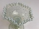 Smukt, gammelt sukkerfad / sukkerskål af klart glas med flæset kant i hvidt glas. Dekoration af blade og blomster.